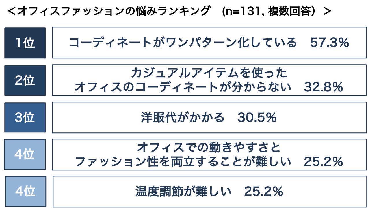 4. オフィスファッションで悩んでいる人は約4人に1人いることが判明。悩んでいることTOP3は「コーディネートがワンパターン化している」、「カジュアルアイテムを使ったオフィスのコーディネートが分からない」、「洋服代がかかる」という結果に。