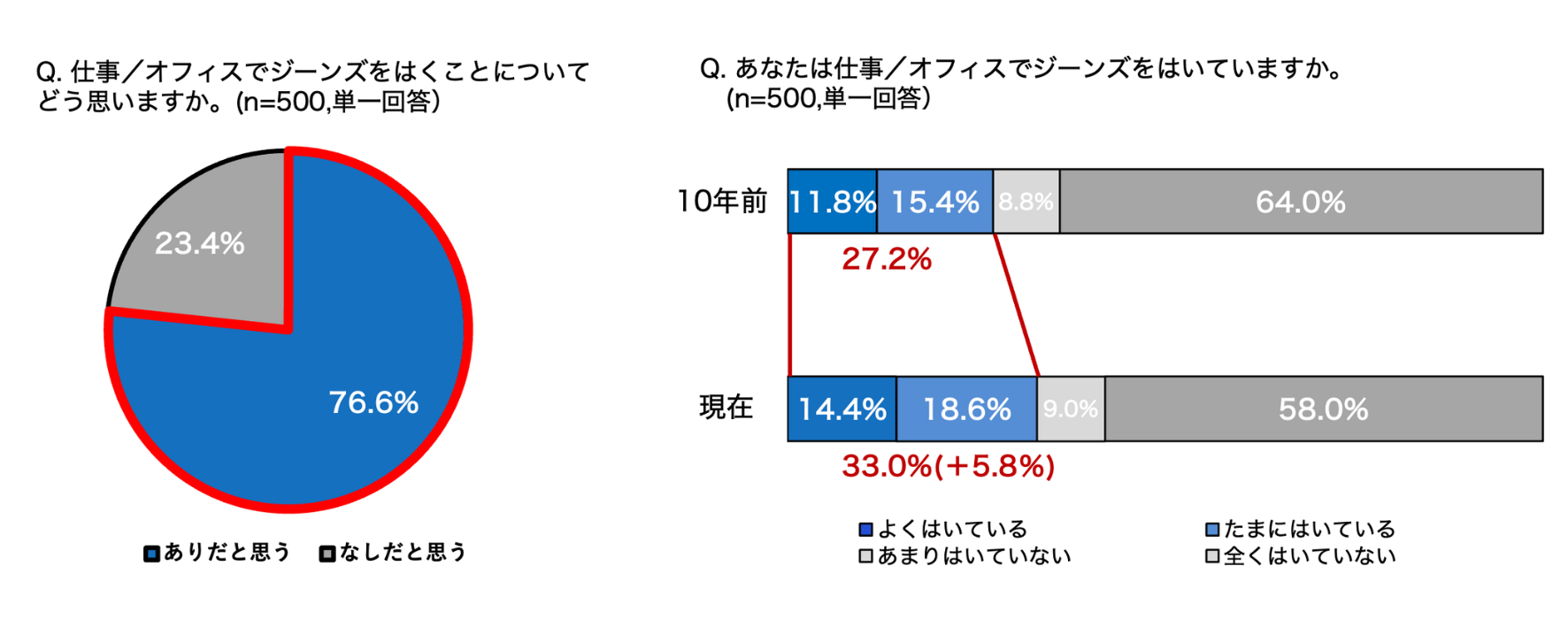 仕事でジーンズをはくことについて「あり」と回答した人は8割近くにのぼる結果に。10年前と現在を比較すると、10業種中9業種でジーンズの着用率が増加傾向にあることも判明。