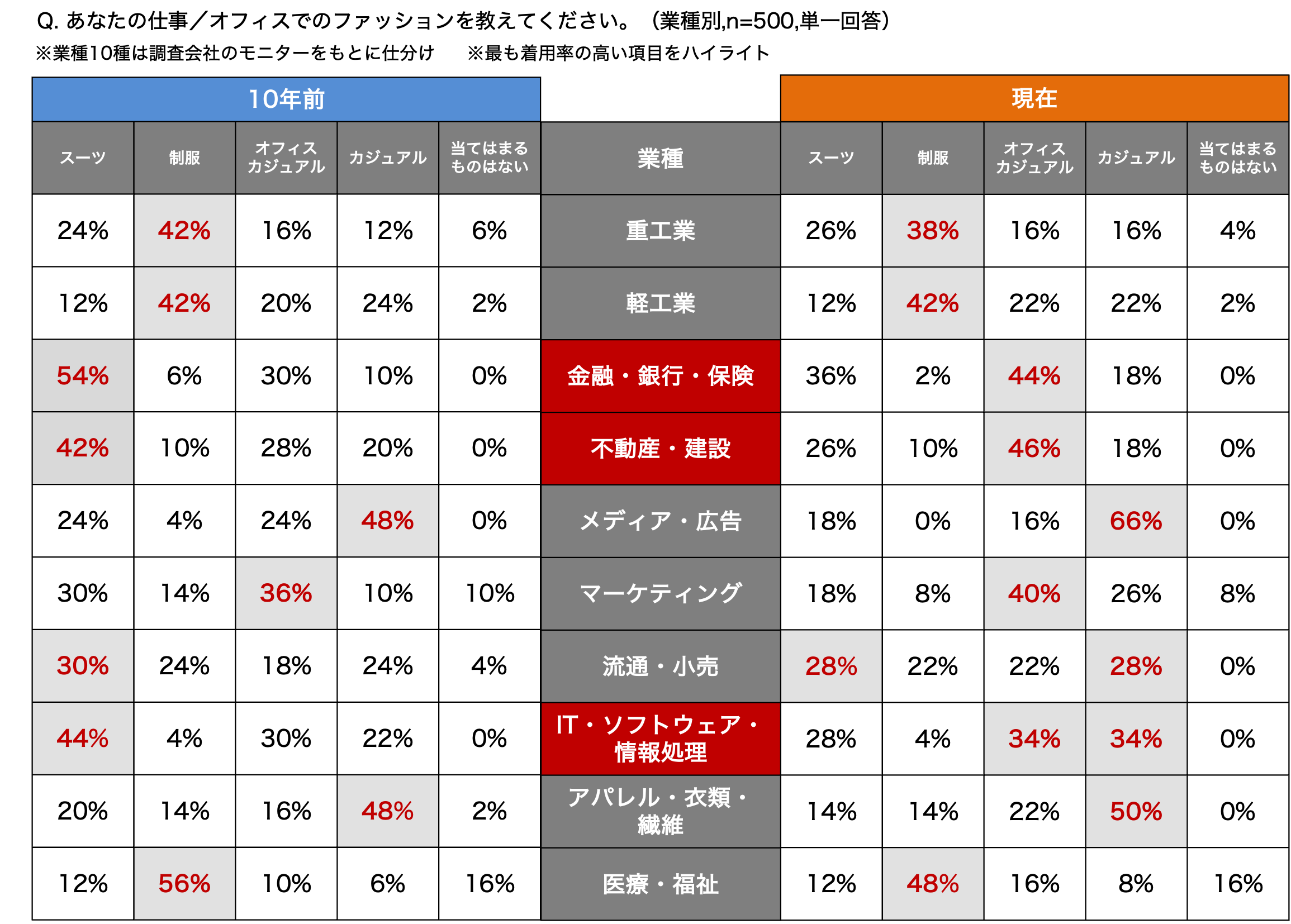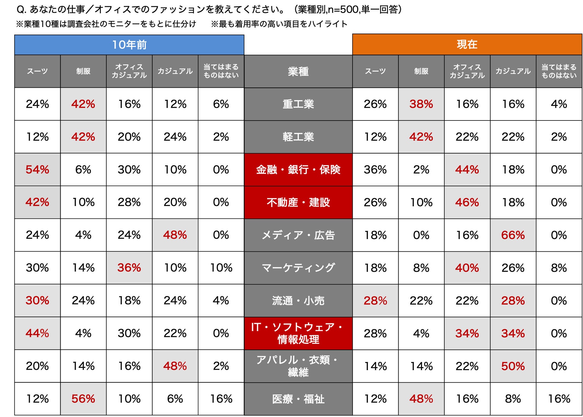 業種別にみると、10業種中3業種(金融・不動産・IT系)では、10年前は「スーツ」が最も多かったのに対し、現在は「オフィスカジュアル」の着用率が最も多く、オフィススタイルが大きく変化していることがわかりました。