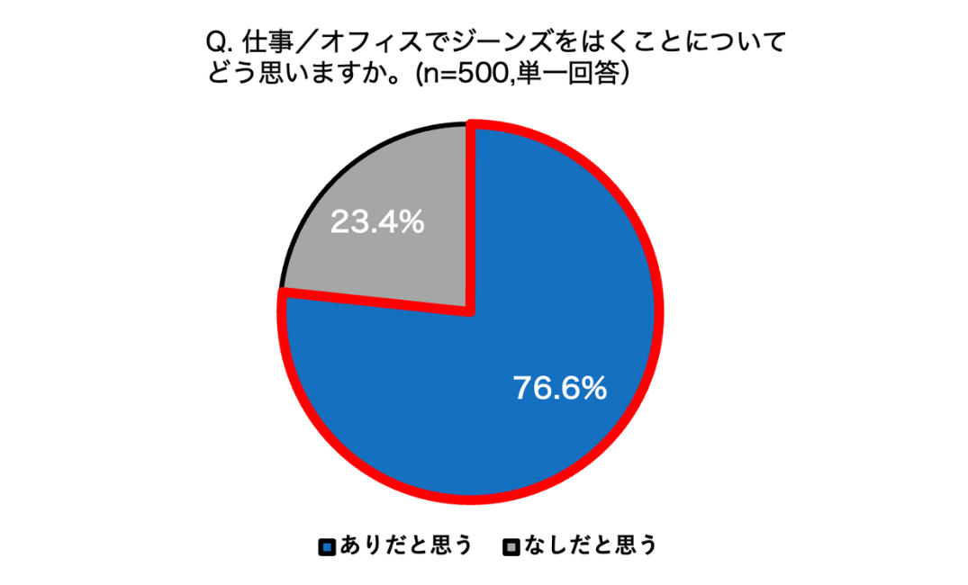 カジュアルアイテムの代表格ともいえる「ジーンズ」をオフィスシーンではくことについて「あり」と回答した人は8割近く(76.6%)にのぼる結果となり、ジーンズがオフィススタイルの1つとして受け入れられていることがうかがえます。