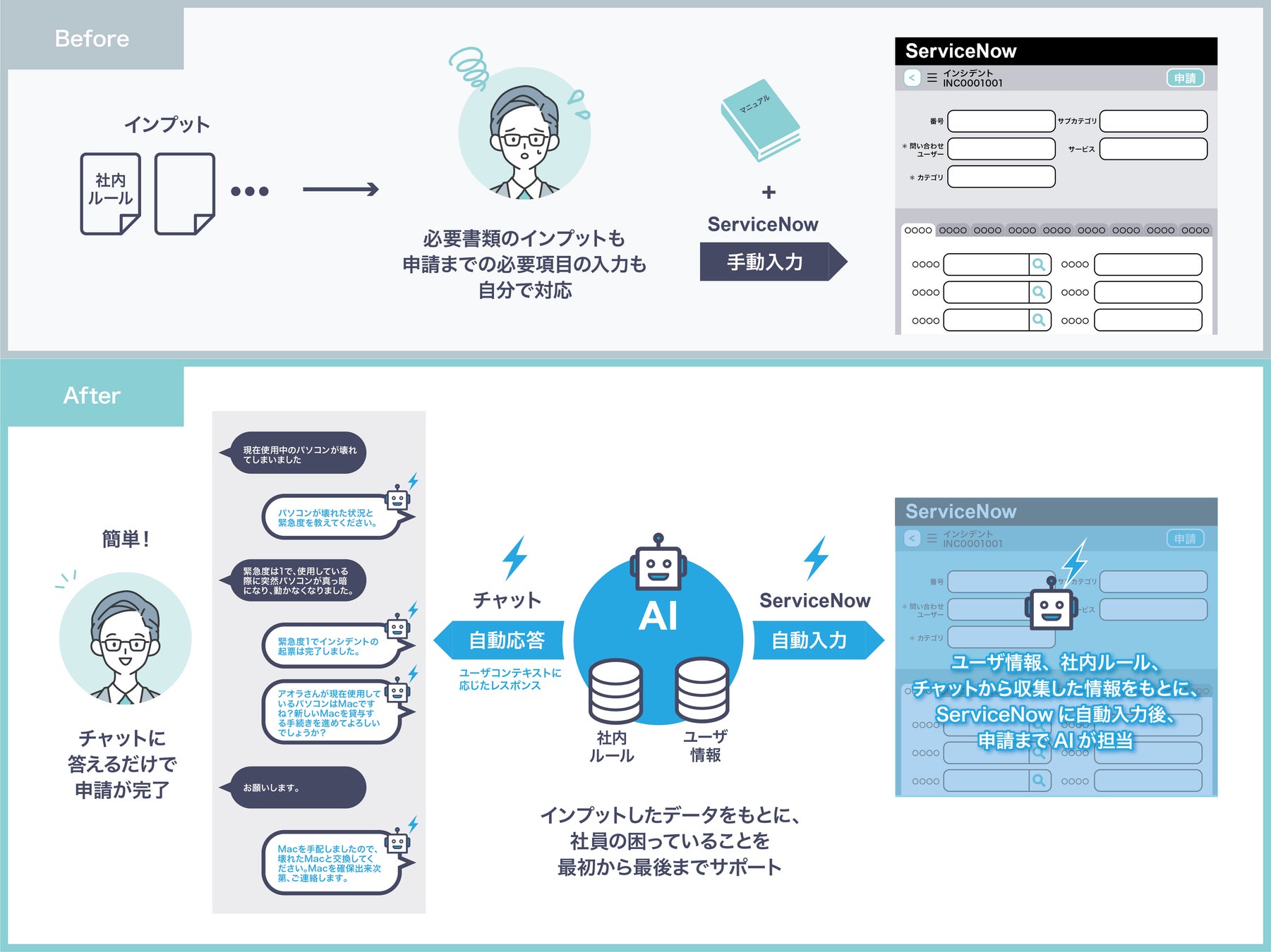 ServiceNowなどのローコードソリューションの普及により、従来はメールやExcelで行われていたバックオフィスの業務を幅広くデジタル化することができるようになりました。一方で、ローコードソリューションの適用範囲を広げていくと、システムへの入力作業が増え、操作が複雑化してしまいます。