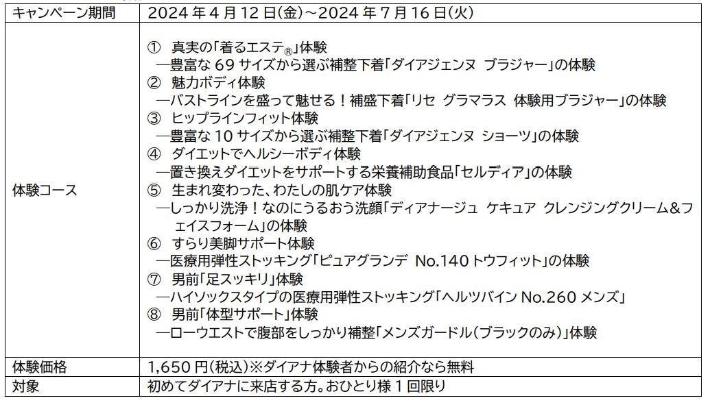ダイアナ独自の豊富な経験と実績、科学的データを基に、お客様一人ひとりのお悩みに合わせた継続的なカウンセリングとアフターフォローで理想のプロポーションづくりをサポートしています。今回の「着るエステ®体験」では、お客様のお悩みに合わせて8つのコースからお好きなコースをお選びいただけます。プロのカウンセラーからアドバイスを受けながら、お好きな商品をじっくり5日間お試しください。お試し後の来店時に、体験前後の比較を行い、その変化をご自身の目で確認・実感することができます。