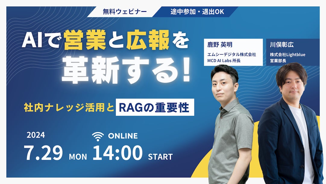 テクノロジーを持って企業の課題解決を支援するエムシーデジタル株式会社(本社:東京都千代田区、代表取締役社長:河内 伸学)は、株式会社Lightblue(本社:東京都千代田区、代表取締役:園田 亜斗夢)と共催で「AIで営業と広報を革新する!社内ナレッジ活用とRAGの重要性」をテーマにしたオンラインセミナーを開催することになりました。