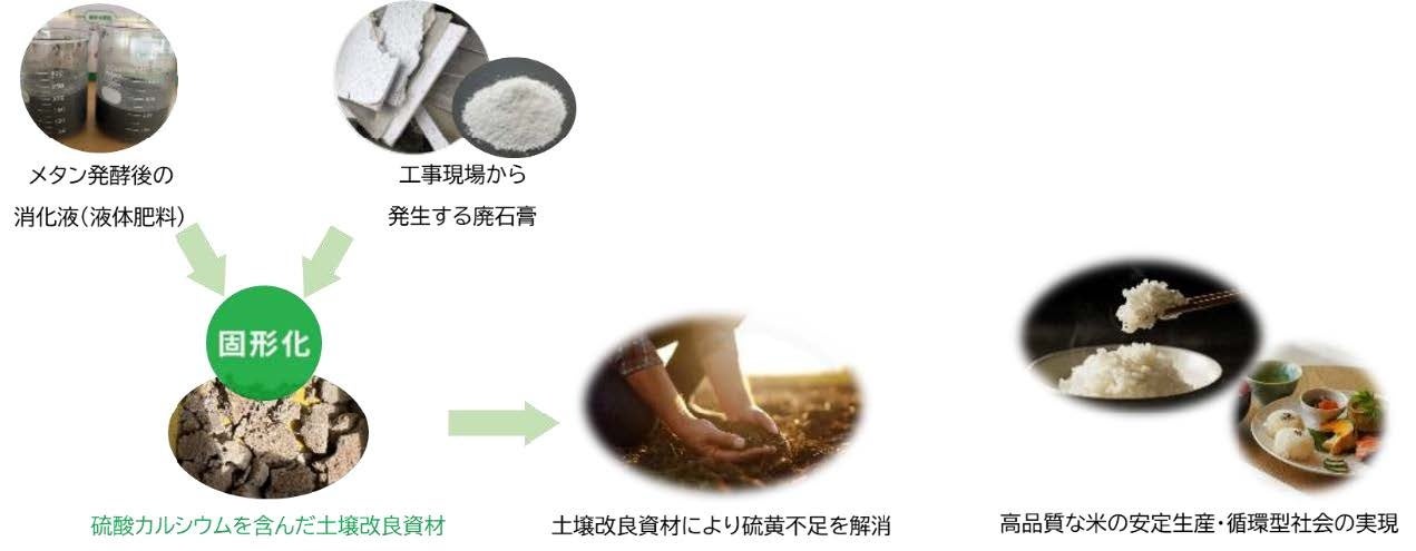 昨今の猛暑による高品質米(一等米)の収穫量の減少の原因である水稲の硫黄欠乏は、硫酸カルシウムに含まれる硫黄分によって予防できるという研究成果があるため、廃石膏を活用した土壌改良資材の導入は稲作農家の課題解決につながると考えられ、持続可能な農業に寄与することが期待できます。