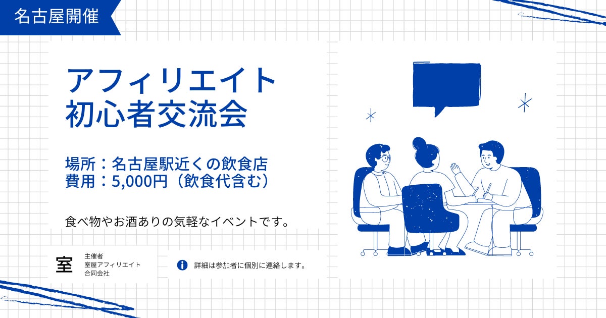 アフィリエイトやブログを始めたばかりの人、これから始めようとしている初心者向けの交流会を室屋アフィリエイト合同会社が開催します。愛知県名古屋市の名古屋駅近くで行います。
