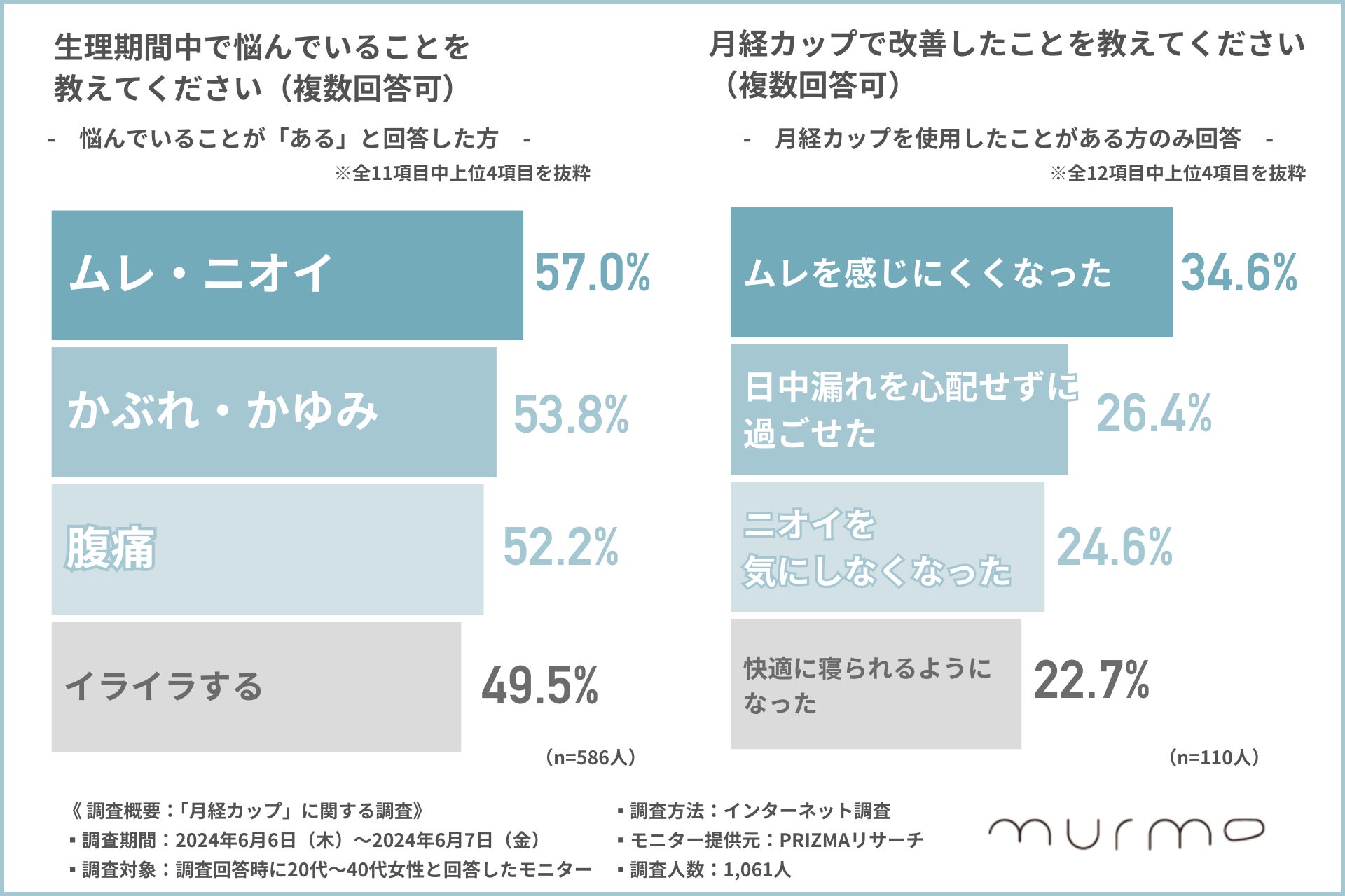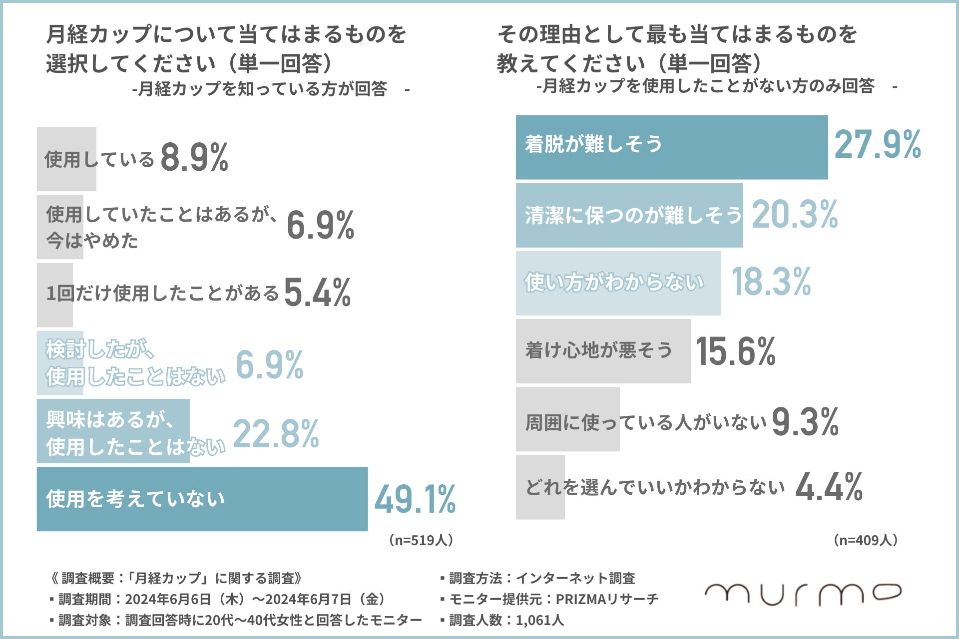 日本製月経カップブランド「murmo/マーモ」(https://murmo.jp)を展開する、株式会社murmur(本社所在地:東京都品川区、代表取締役CEO:高島華子)は、20代〜40代女性を対象に「月経カップ」に関する調査を実施しました。
