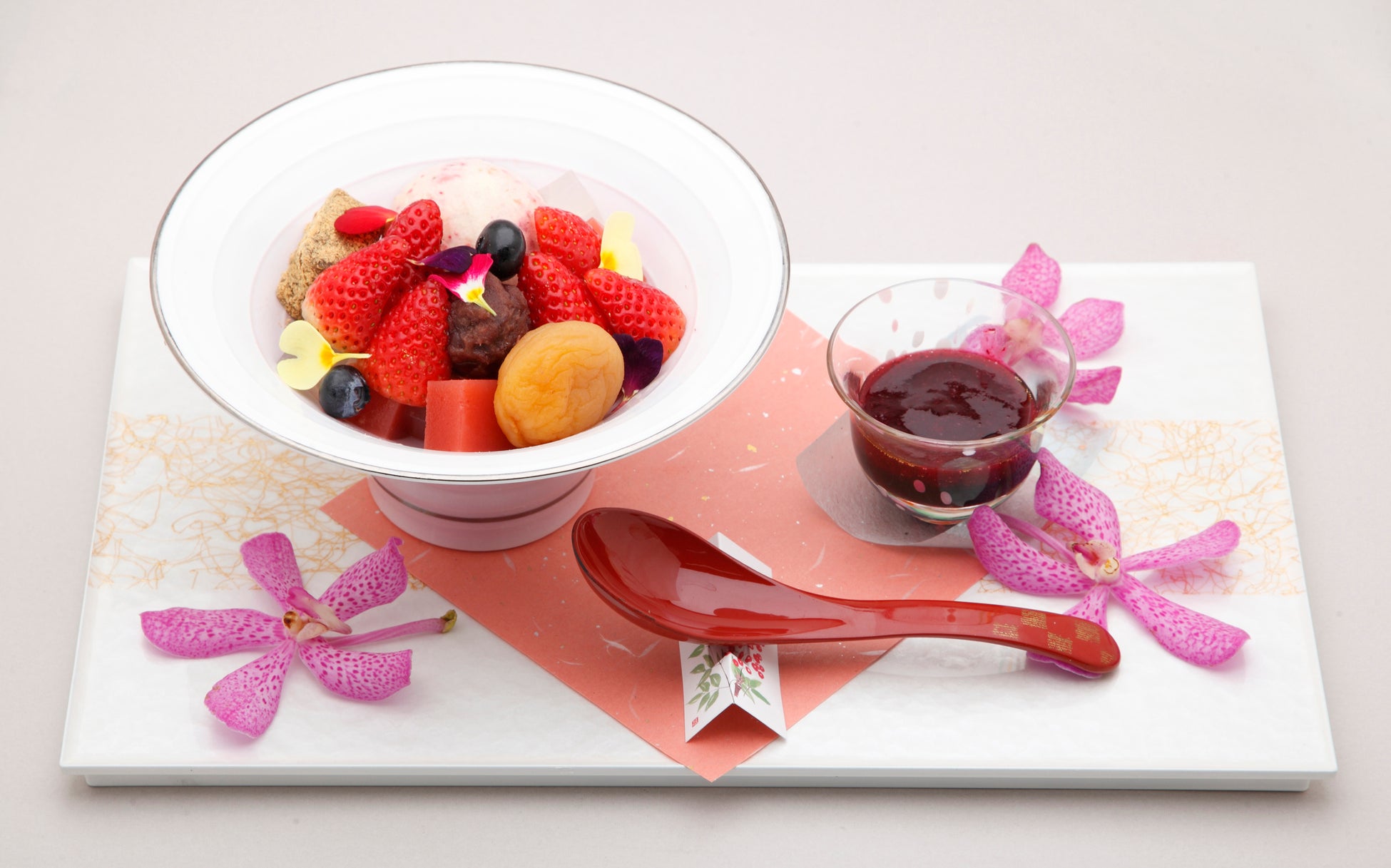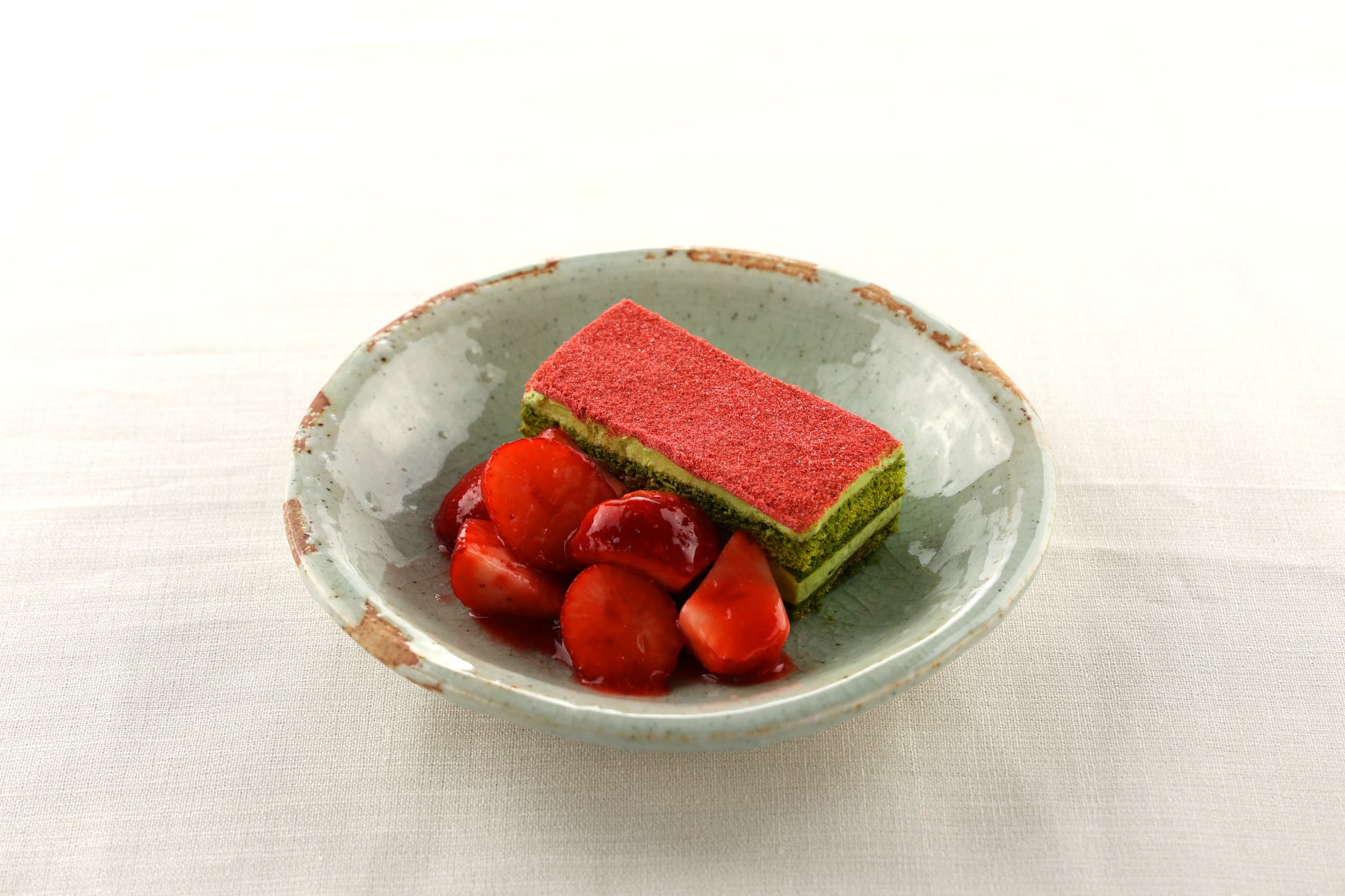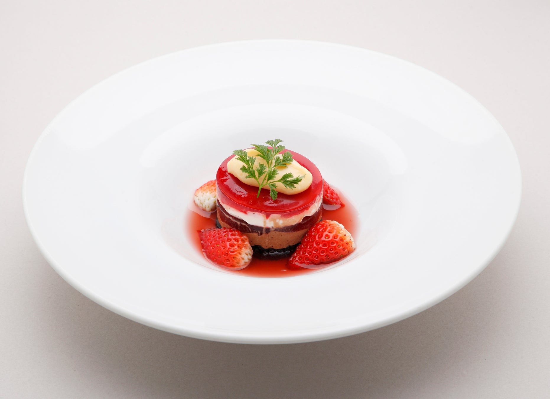 とちぎのいちご“とちあいか”の良さを生かしたくて、シンプルにゼリーで寄せました。その上にそば粉のムース、とちあいかのソースと果実を飾りました。とちあいかのゼリーとそば粉のムースの味と食感の違いは、口の中に新鮮な感動を呼び起こします。