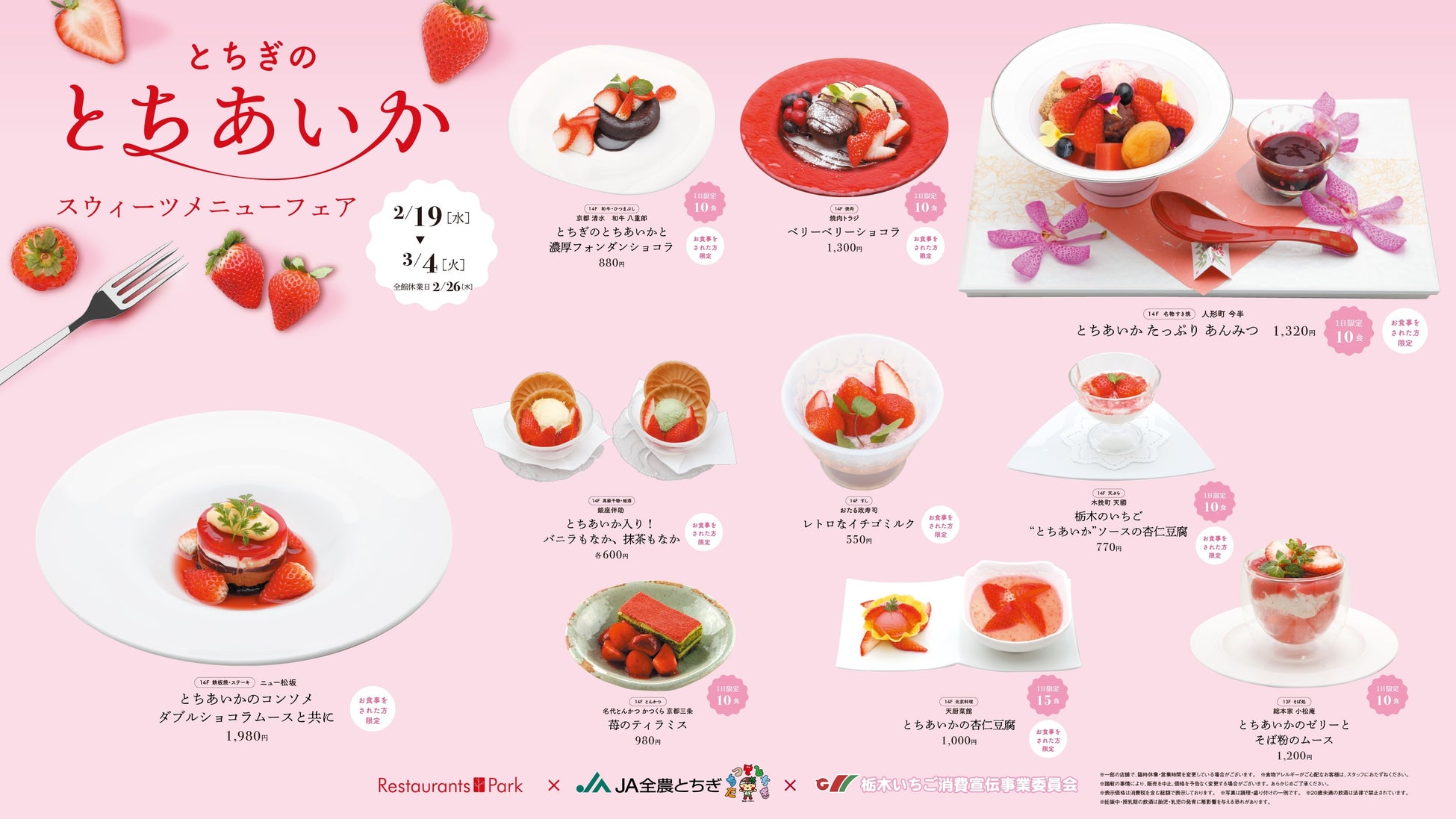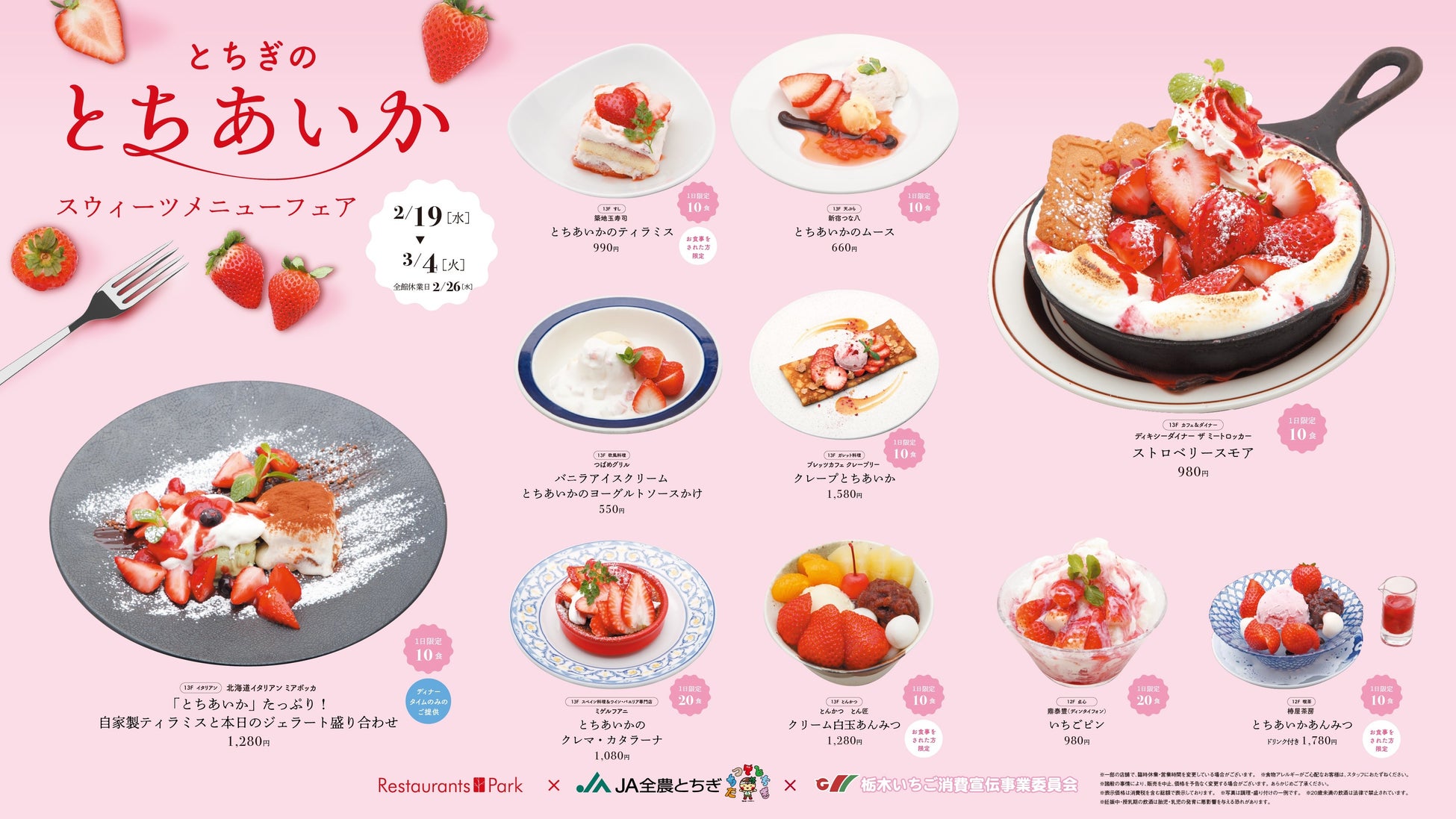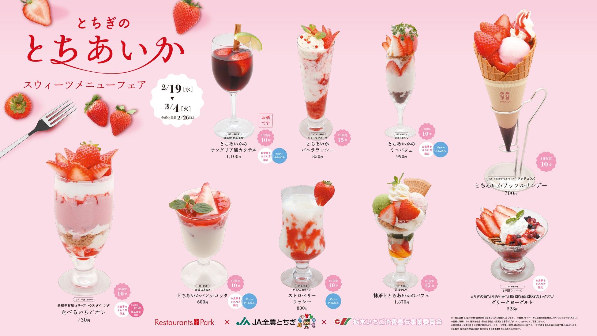新宿タカシマヤ レストランズ パーク(12階~14階)レストラン30店舗で、JA全農とちぎと栃木いちご消費宣伝事業委員会提供の甘さ溢れるブランド苺「とちあいか」の期間限定オリジナルメニューをどうぞ。