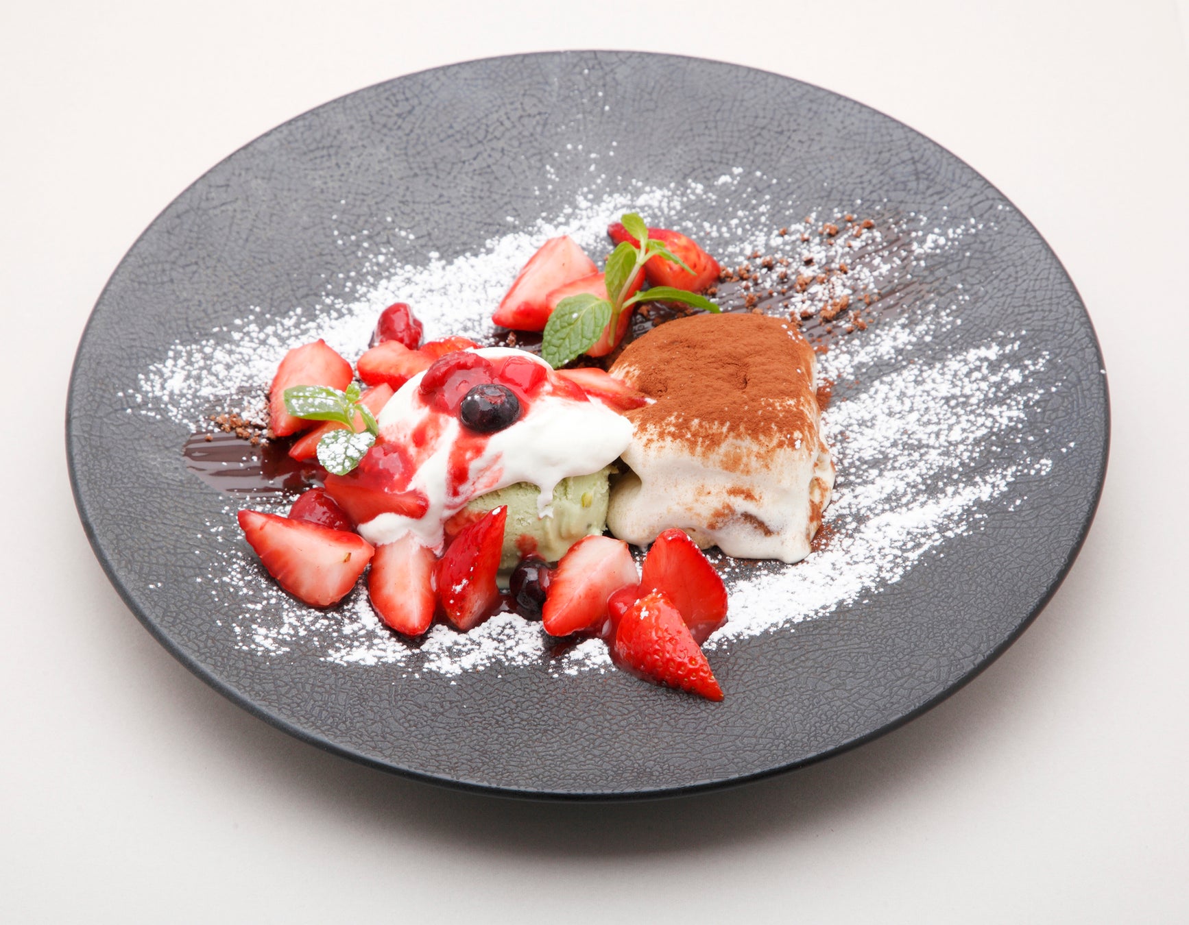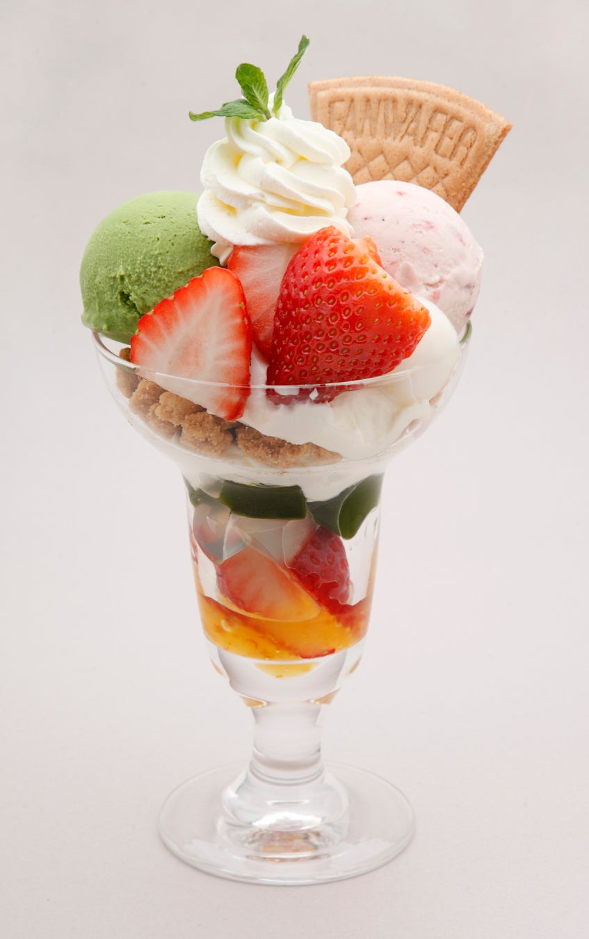 とちあいかの果実をふんだんに使用し、当店自慢の抹茶ゼリーや抹茶生地、抹茶アイスといちごアイスを盛り付けました。とちあいかの甘みと抹茶のほろ苦さをあわせた特製パフェです。底に見えるみかんソースの爽やかな酸味が美味しさをさらに引き立てます。