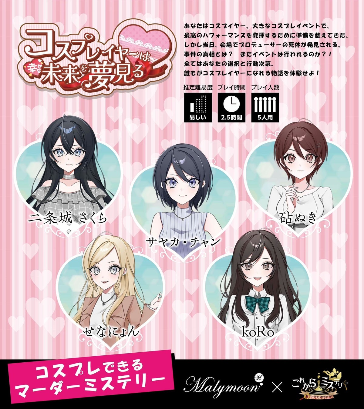 マーダーミステリーの事業を展開する株式会社これからミステリー(本社:東京都渋谷区、代表取締役:飯田祐基、以下これからミステリー)は、人気コスプレブランド「Malymoon」とのコラボレーションにより、新シナリオ『コスプレイヤーは幸せな未来を夢見る』をリリースいたしました。本シナリオは、2024年11月1日より、これミス中野店にて公演を開始いたします。