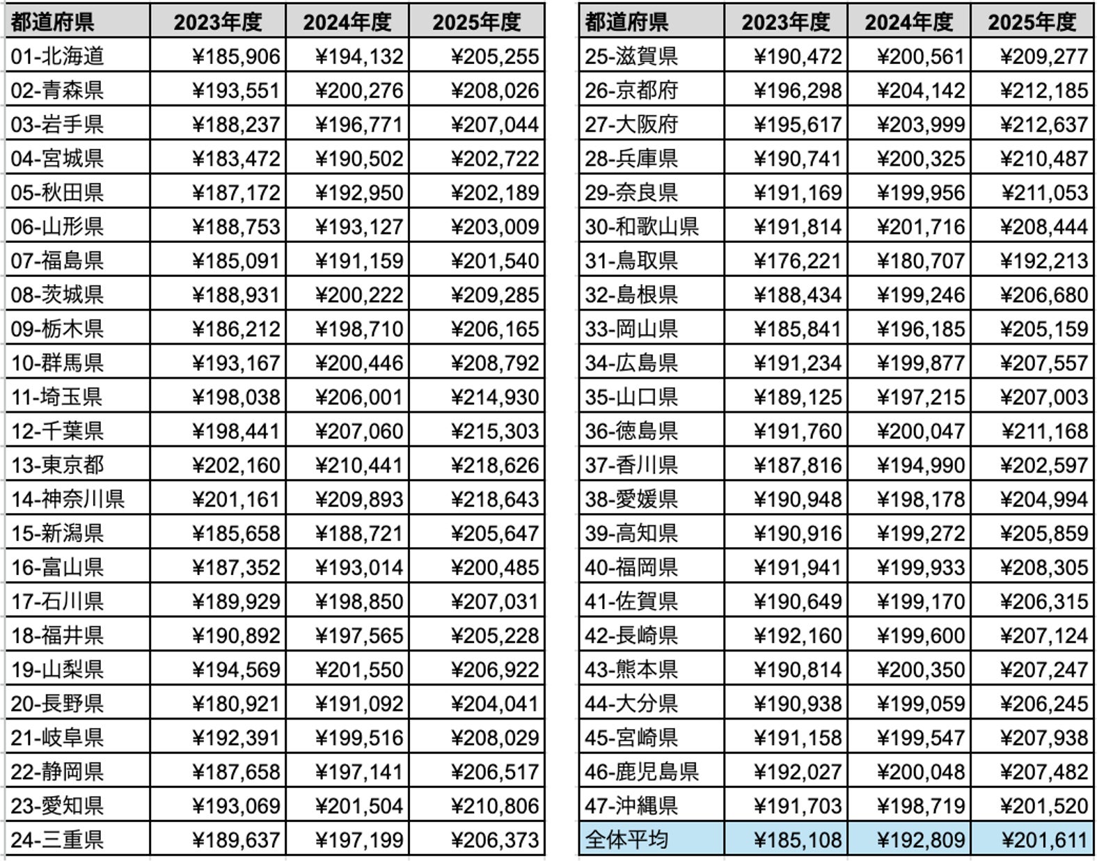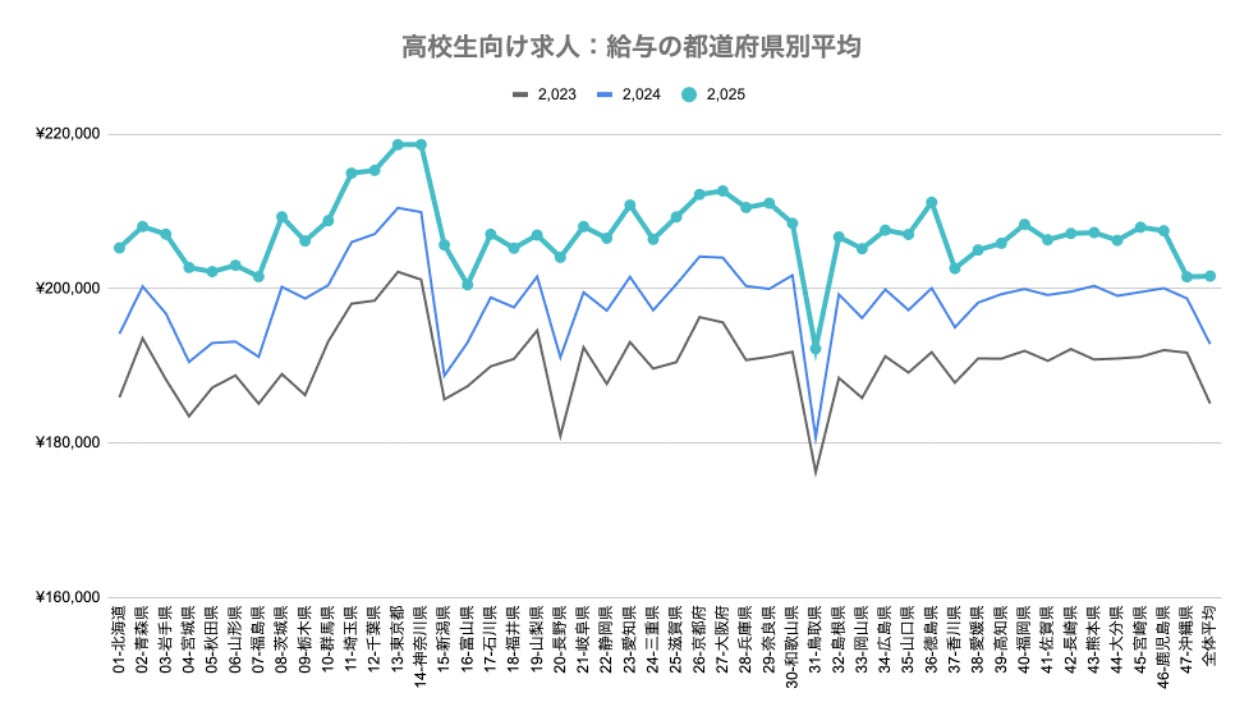 また、47都道府県中46都道府県が月給20万円台に到達し、前年の17都道府県から大幅に増加しました。
