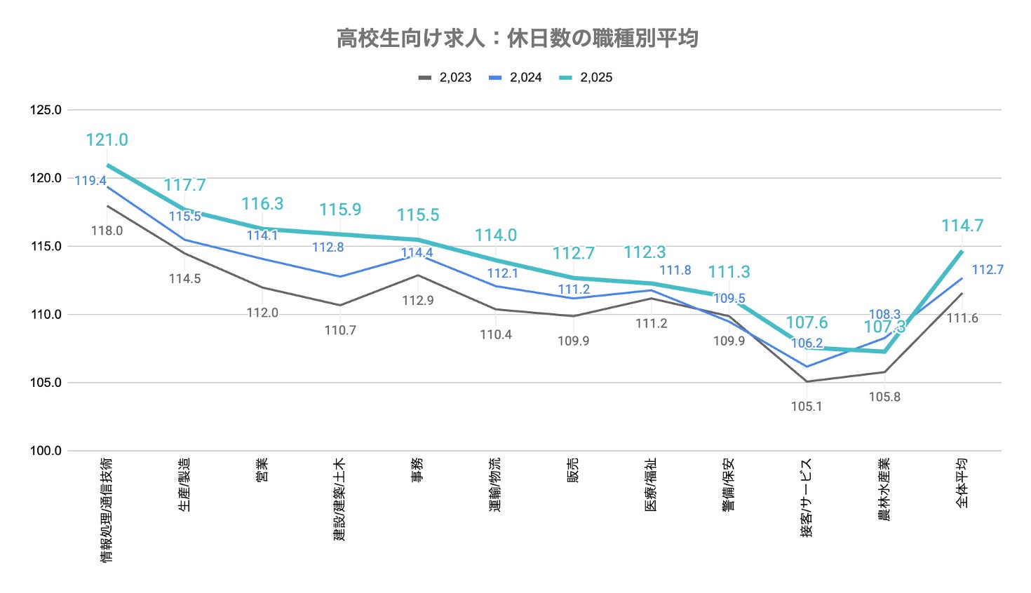 高校生の職場選びにおいて重視される「休日数」は全体平均で114.7日/年となり、前年から2日の増加となりました。職種別では、昨年に続き情報・通信系が121.0日で最多。また、建設関係は115.9日/年と、昨年から増加しており改善がうかがえます。