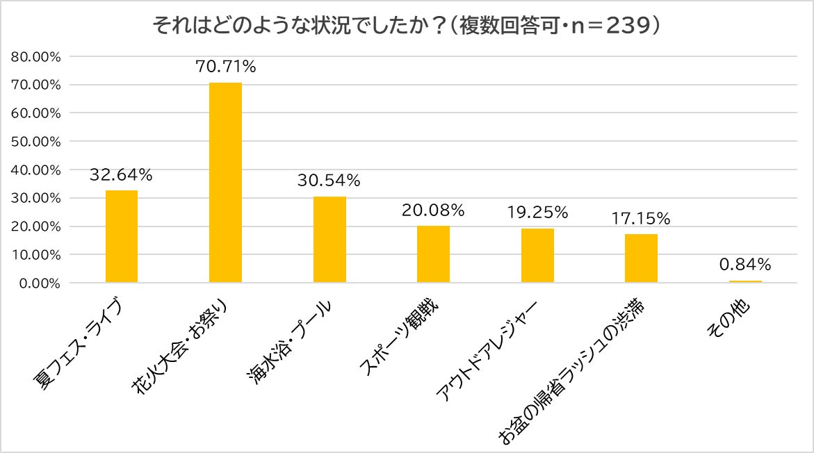 中でも、「花火大会・お祭り」(70.7%)、「夏フェス・ライブ」(32.6%)、「海水浴・プール」(30.5%)など、夏の定番屋外イベントでのトイレ問題が多数報告されました。夏の屋外イベントは、トイレの数が限られていたり、混雑で利用が難しい状況になりがちです。特に人出の多い場合は長蛇の列ができるほか、トイレの場所が分かりにくく、不安や焦りを感じたという声も多く寄せられました。