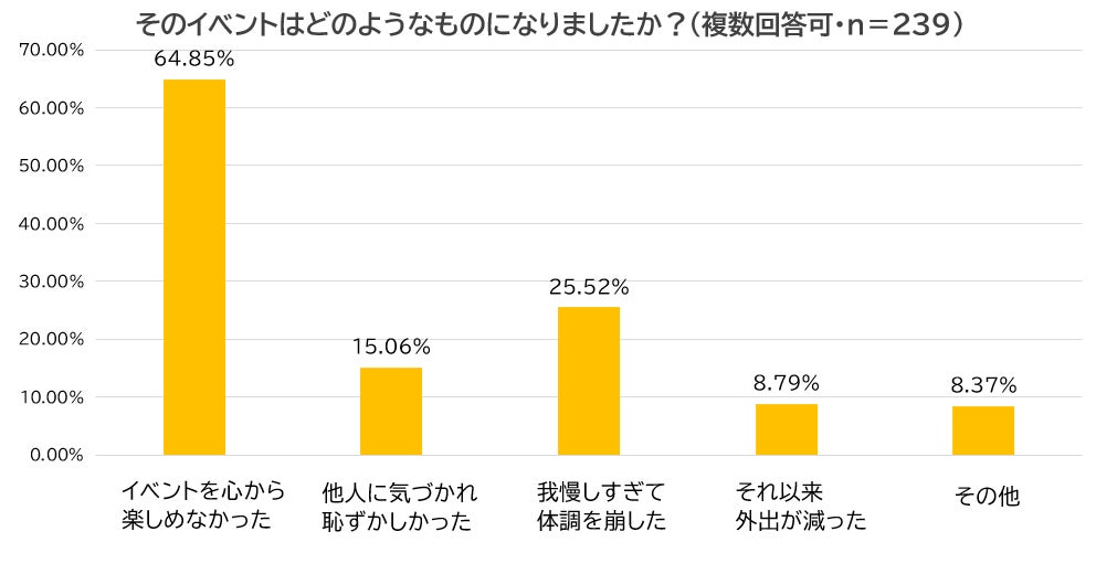 また、「イベントを心から楽しめなかった」(62.4%)、「体調を崩した」(28.4%)、「恥ずかしい思いをした」(16.5%)など、切実な声も多く寄せられました。トイレに行けない不安や焦りが楽しみを奪うだけでなく、体調やメンタルにも影響を及ぼしている様子がうかがえます。中には「その経験以来、人が多いイベントを避けるようになった」という声もあり、排泄への不安が、外出やイベント参加に慎重になる背景のひとつとして浮かび上がっています。