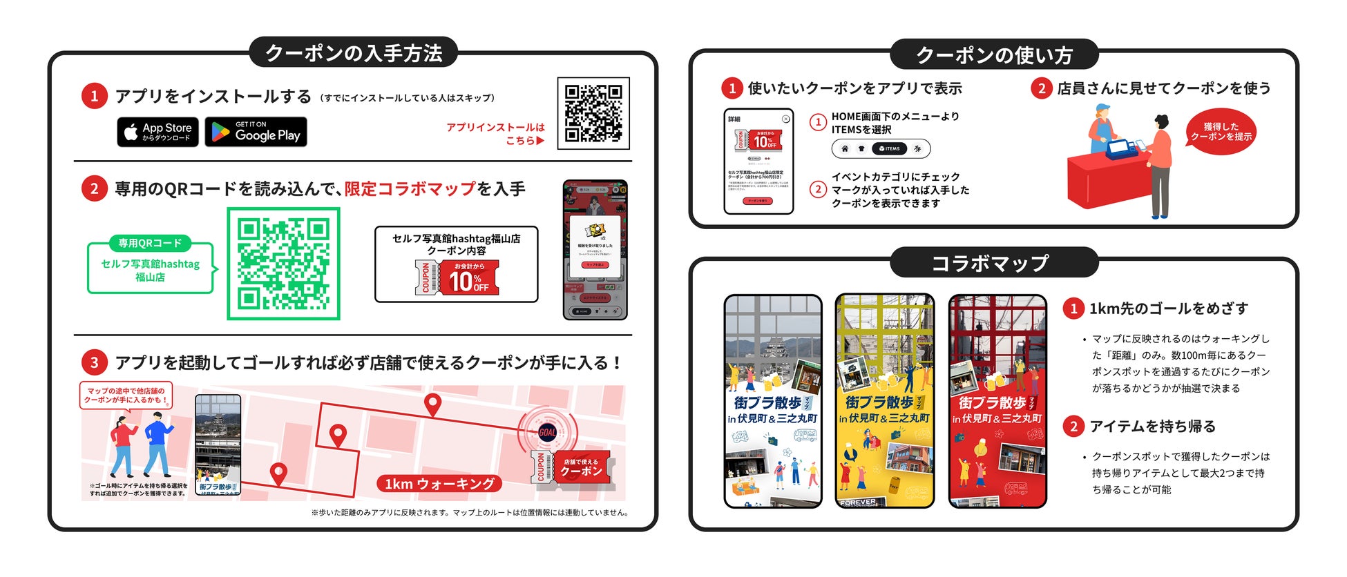 ウォーキング中は商店街の町並みをクリエイティブに採用したコラボマップを進みます。道中でクーポンを手に入れるチャンスを用意しています。