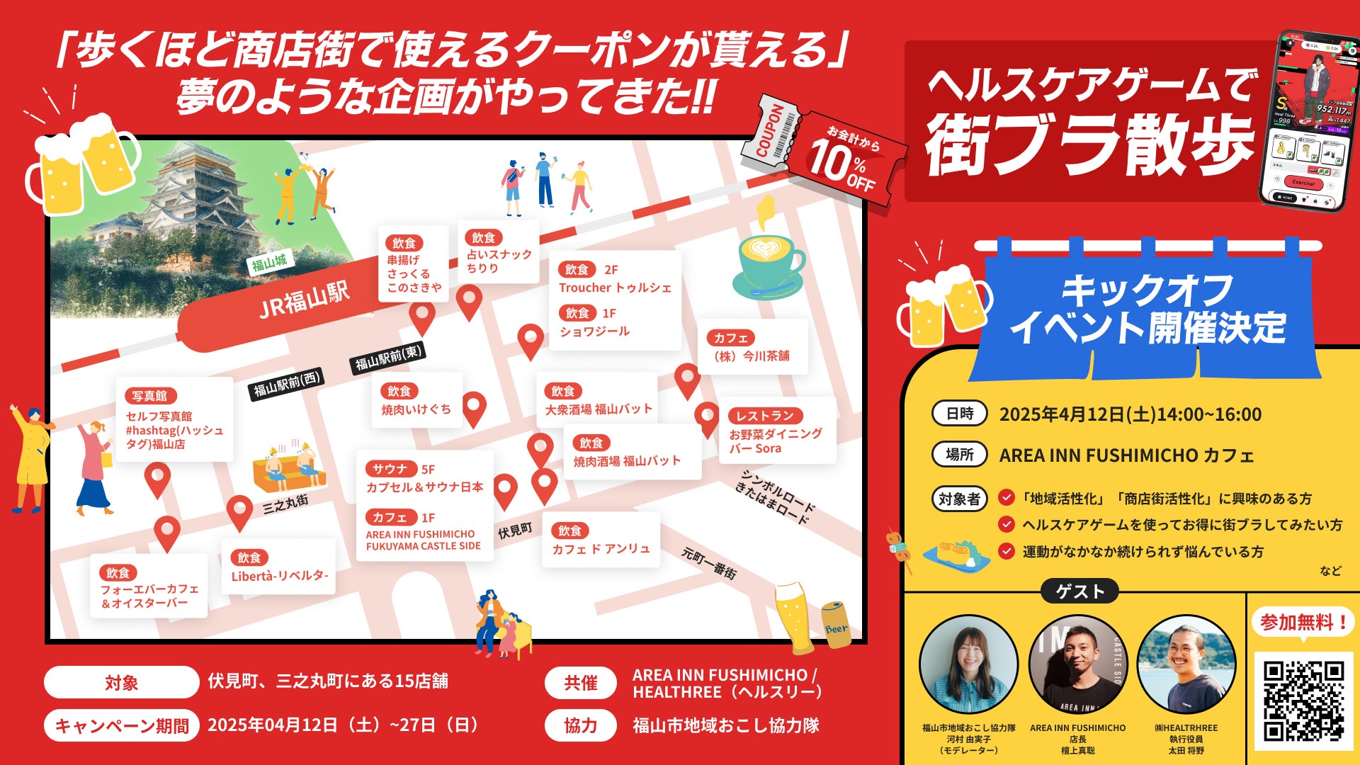 このたび、ヘルスケアゲーム「HEALTHREE(ヘルスリー)」を運営する株式会社HEALTHREE(所在地:東京都渋谷区、代表取締役CEO:山本 真也 / 田中 厳貴、読み:ヘルスリー)は、まち全体をひとつの「宿」と見立てた「まちやど」事業を展開する「AREA INN FUSHIMICHO」(運営会社:株式会社フューレック、所在地:広島県福山市)とのコラボレーションにより、広島県福山駅周辺(伏見町・三之丸町)の15店舗の協力のもと歩いてクーポンが貰える「ヘルスケアゲームで街ブラ散歩」キャンペーンを開催します。