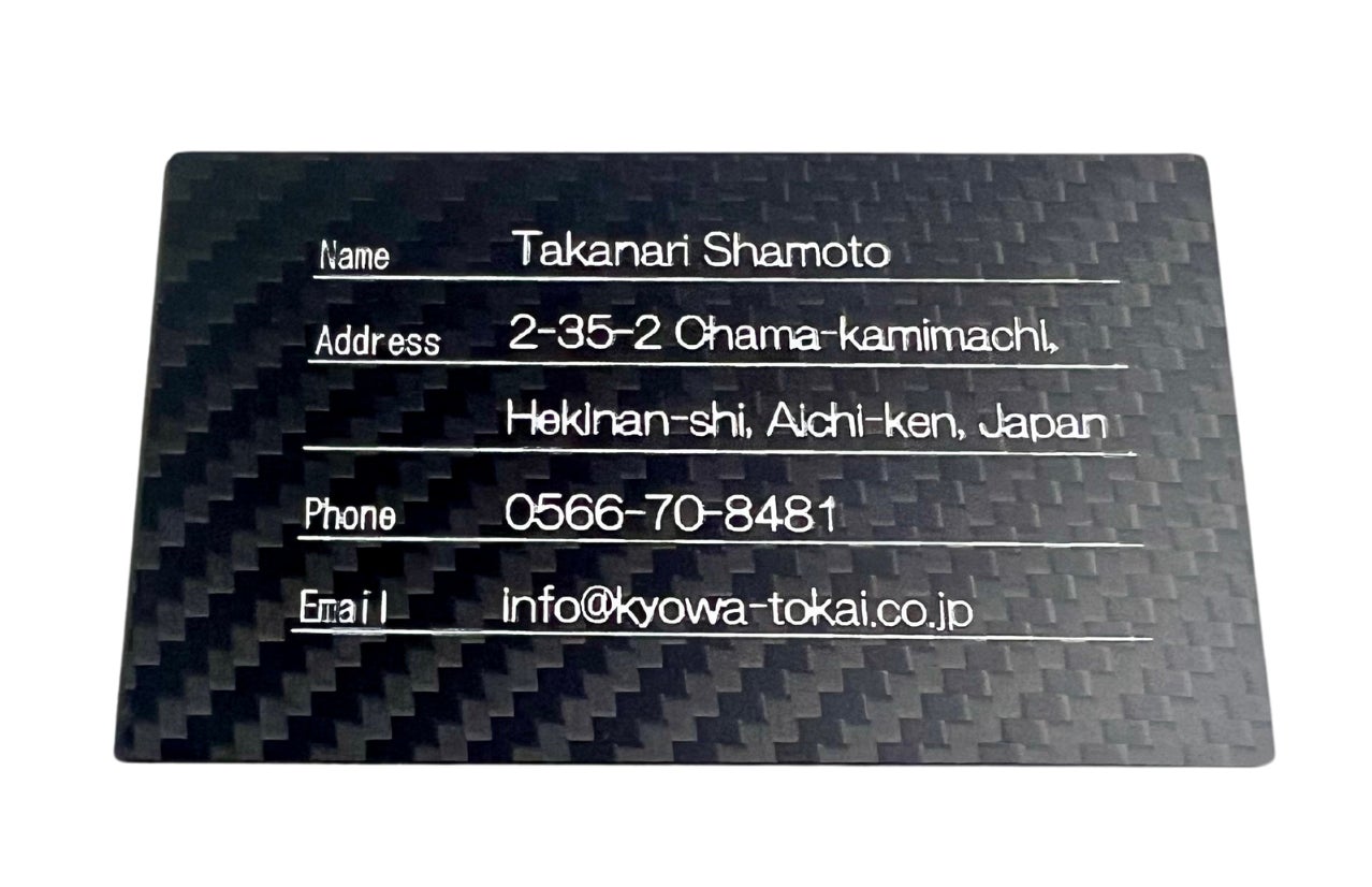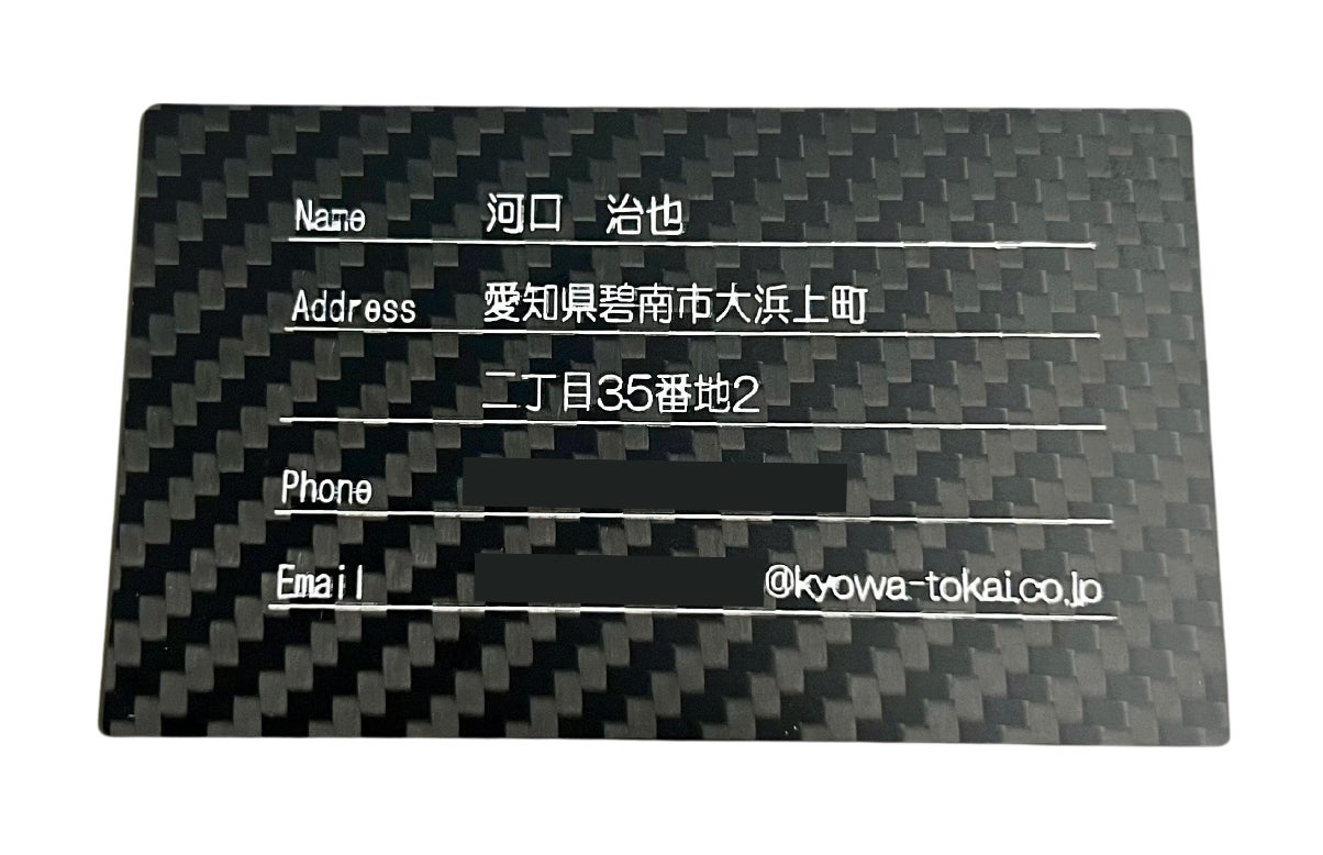 CFRP製カードには、お客様の氏名、電話番号、住所、メールアドレスを彫り込み、展示会後に送付いたします。