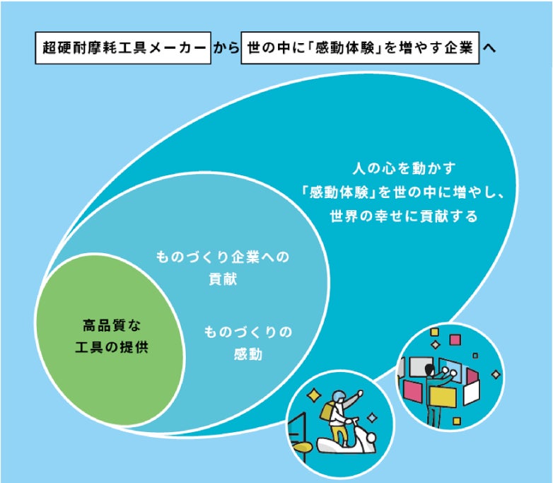 当社の強みは人財や技術、開発力です。当社は超硬耐摩耗工具専業でスタートしましたが、100年企業を目指すために当社の強みを生かしながら、事業ドメインを広げ新たな事業に挑戦していく、という今後の発展性に期待を込めて新たなビジョンを『人と素材と技術の力で感動体験を。』としました。