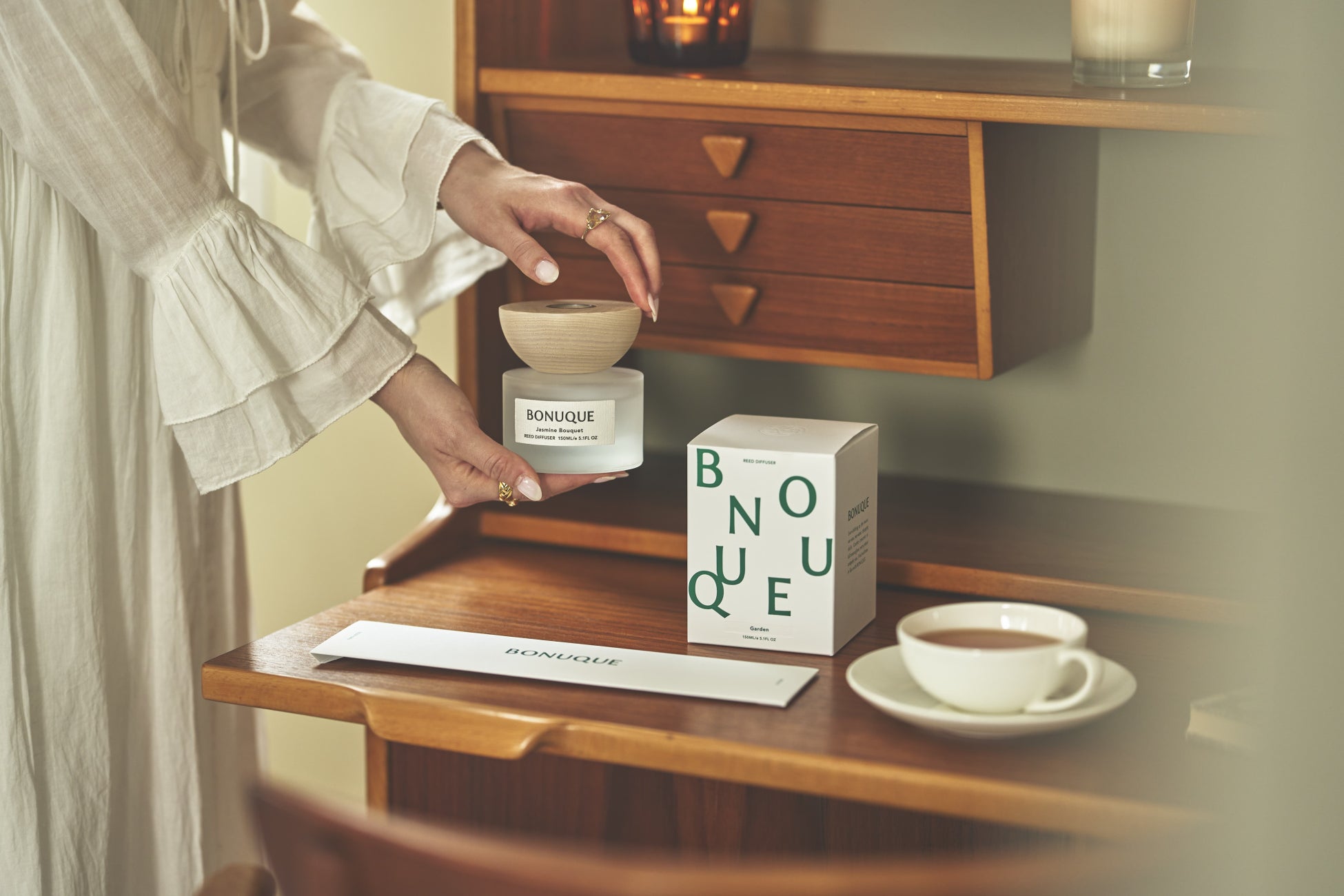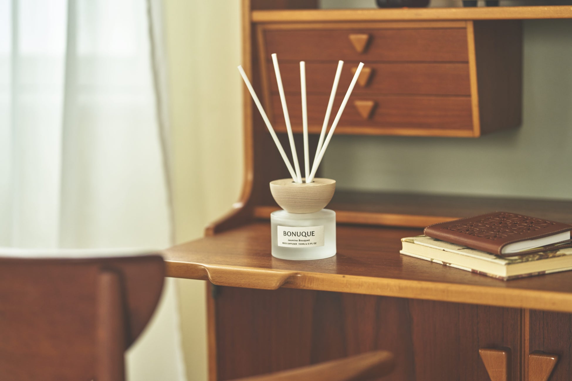 BONUQUE は「香りを纏うインテリア」という発想から、約 2 年にわたり試作を重ねてきました。ウッドの削り角度、塗装の種類、リードディフューザースティックが触れる箇所のコーティング方法、高級感が損なわれない質感まで徹底的に検証。完成した〈ホワイトライン〉は、使用後も花器やオブジェとして楽しめるインテリア性と、何気ない日を特別にしてくれる香りを両立させています。
