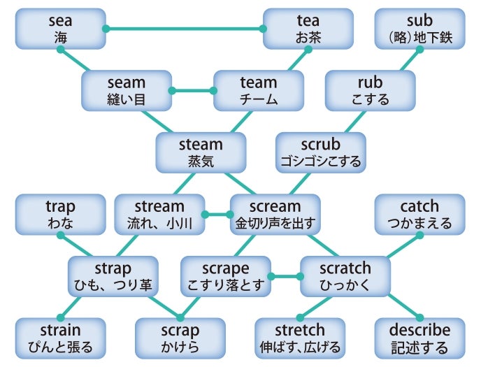 英単語の中にも、crack:ひびが入る の cr などオノマトペを思わせる要素が含まれています。scream / scratch の cr / scr など、共通する「音象徴文字:phonestheme」を含む語を、まとめて検索できます。