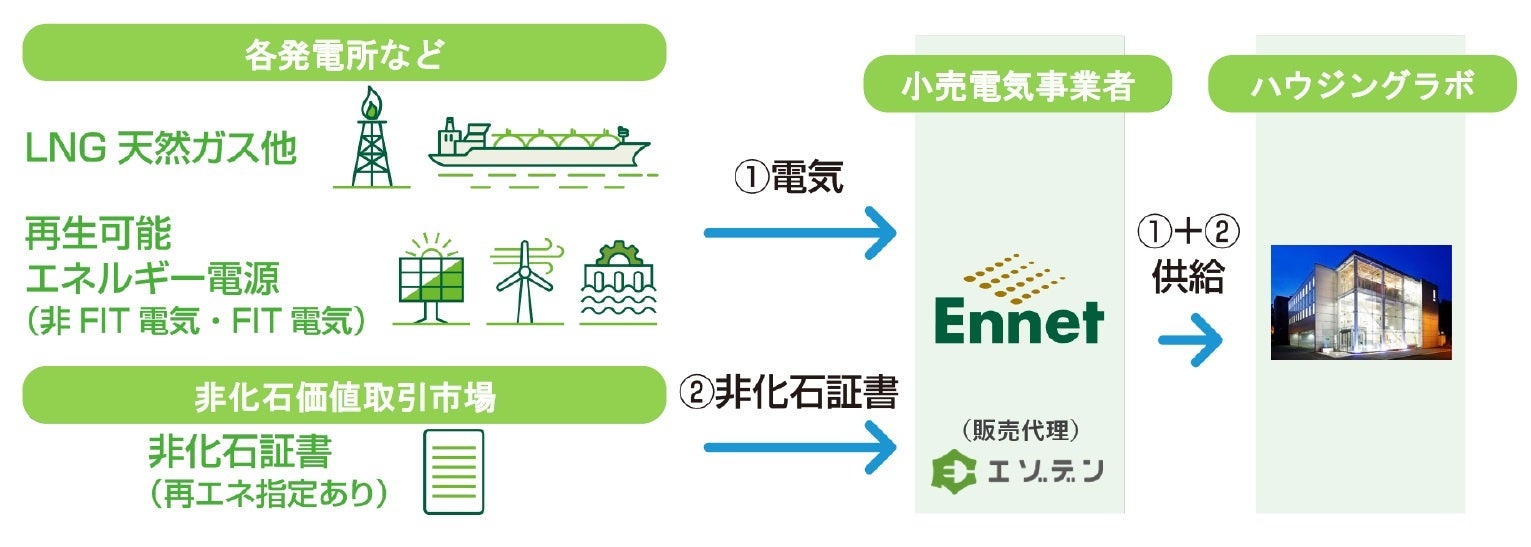 弊社は、代理店である株式会社エゾデンを介し、株式会社エネット(以下エネット)と小売供給契約を締結しておりますが、このたびエネットの再エネ導入支援メニュー「EnneGreen」を導入し、電気(主に天然ガス発電等の電気)に再エネ指定の非化石証書を組み合わせることで実質的に再生可能エネルギー電気(二酸化炭素排出量がゼロ)100%を実現しました。