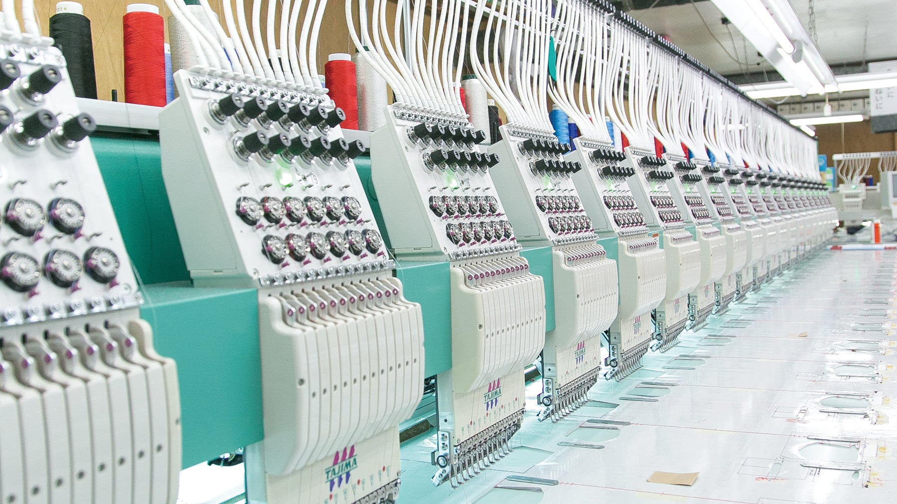区内の優れた製品・技術を認定する「足立ブランド」にも認定された都内最大の刺繍工場、株式会社グレイスエンブを訪れると、多頭式と呼ばれるズラリと並ぶミシンに圧倒されます。