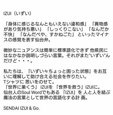 『 仙台弁の「いずい」をコミュニケーションツールとしてつながり助け合う社会を目指す 』をコンセプトにTシャツやトートバックを販売する アパレルブランド『SENDAI IZUI & Go.』(所在地:仙台市 代表:村田 小栄子)は、その思いを具現化し、つながり助け合う きっかけになる「IZUIカード」を企画しました。