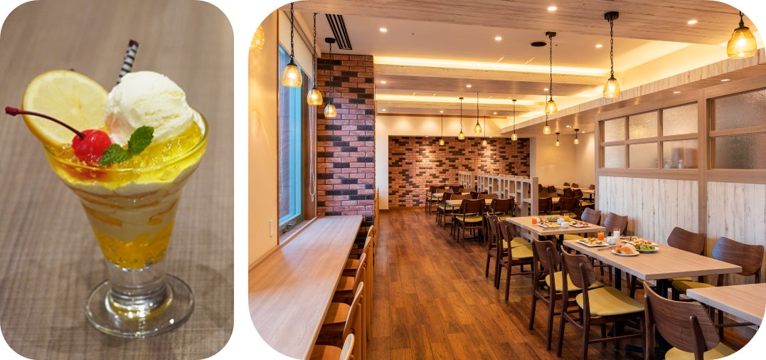 2024年7月7日(日)より提供を開始する夏季限定パフェは、夏らしくレモンをベースにした味と食感が違う2種類のゼリーを使用し、オリジナルカスタードクリームにも柑橘系のフレーバー等を練り込んだ、爽やかな風味の夏らしいパフェとなっています。生クリーム、カスタードには北海道産の原料を使用し、旅先の思い出にぴったりの一品です。