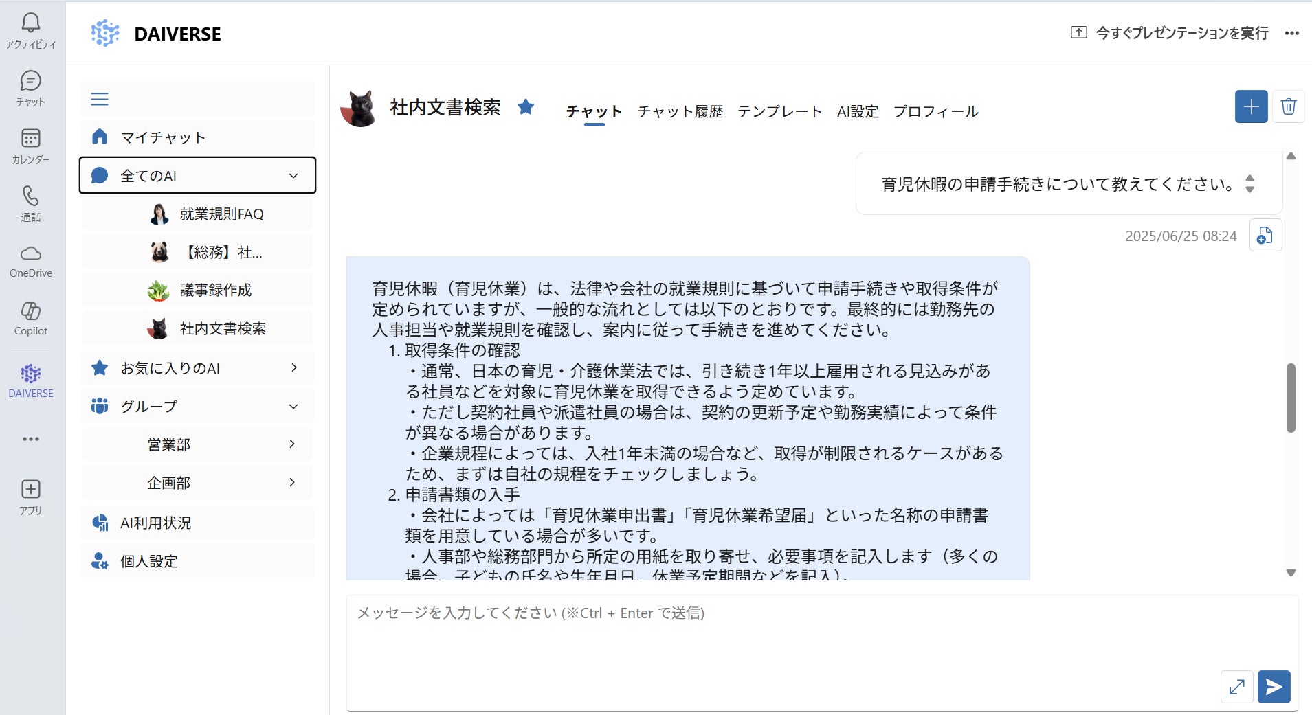 Apps in Microsoft Teams上で『DAIVERSE』を利用することが可能となりました。PC・スマートフォンの両方に対応しています。これにより、外出中でも情報収集・要約・問い合わせ対応などに対応することができ、場所や時間を問わずAI Agentを活用したシームレスな作業が可能となり、さらなる業務効率の向上を支援します。