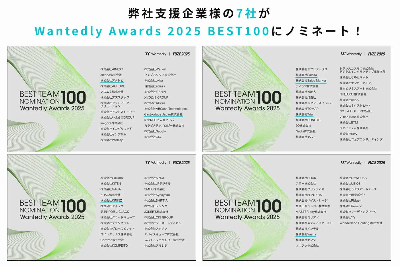 『Wantedly Awards 2025』の「BEST TEAM NOMINATION 100」には、Yaaha社を含めた支援先7社が選出されました。