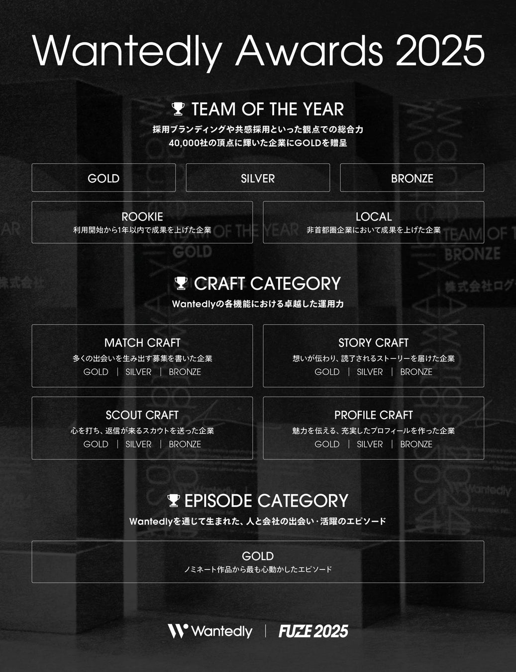 『Wantedly Awards』は、40,000社以上のWantedly登録企業を対象に、年間(2024年8月〜2025年7月)の活動を通じて「採用ブランディング」や「共感採用」を実践した企業100社が選ばれる表彰制度です。採用数といった量的な指標だけでなく、企業の魅力やカルチャーを適切に発信し、候補者との理想的なマッチングを実現しているかという"採用の質"が評価の軸となっています。