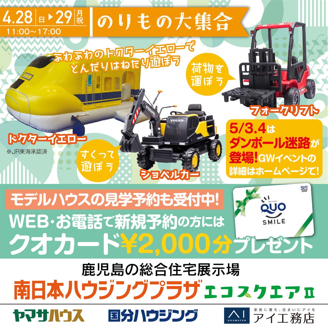 鹿児島市与次郎1丁目、南日本新聞社となりの総合住宅展示場「南日本ハウジングプラザ」では、ゴールデンウイーク期間中、家族連れで楽しめるイベントを開催します!