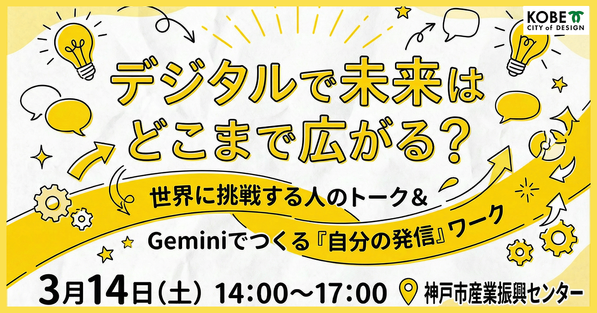 神戸市主催の学生向けプロジェクト「こうべデジタル活動部(デジ活)」の最終回イベントを3月14日(土)に開催します。運営はAIリスキル株式会社(本社:大阪市北区、代表取締役:山原慎也)。世界に挑戦する実践者3名のトークと、Google Geminiを使ったポートフォリオ作成ワークの2部構成です。