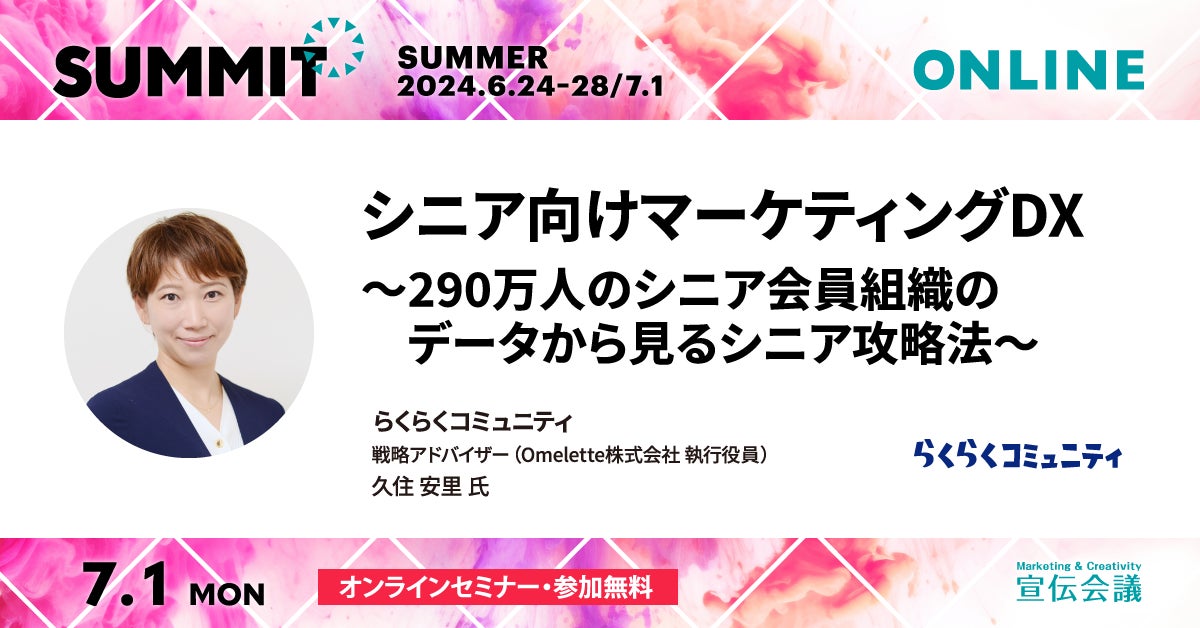 Omelette株式会社(東京都港区、代表取締役 羽野仁彦)は、運営するWEBサイト「シニアマーケティングDX」にて、宣伝会議サミット2024夏 無料オンラインセミナー「シニア向けマーケティングDX~290万人のシニア会員組織のデータから見るシニア攻略法~」の開催を発表いたします。