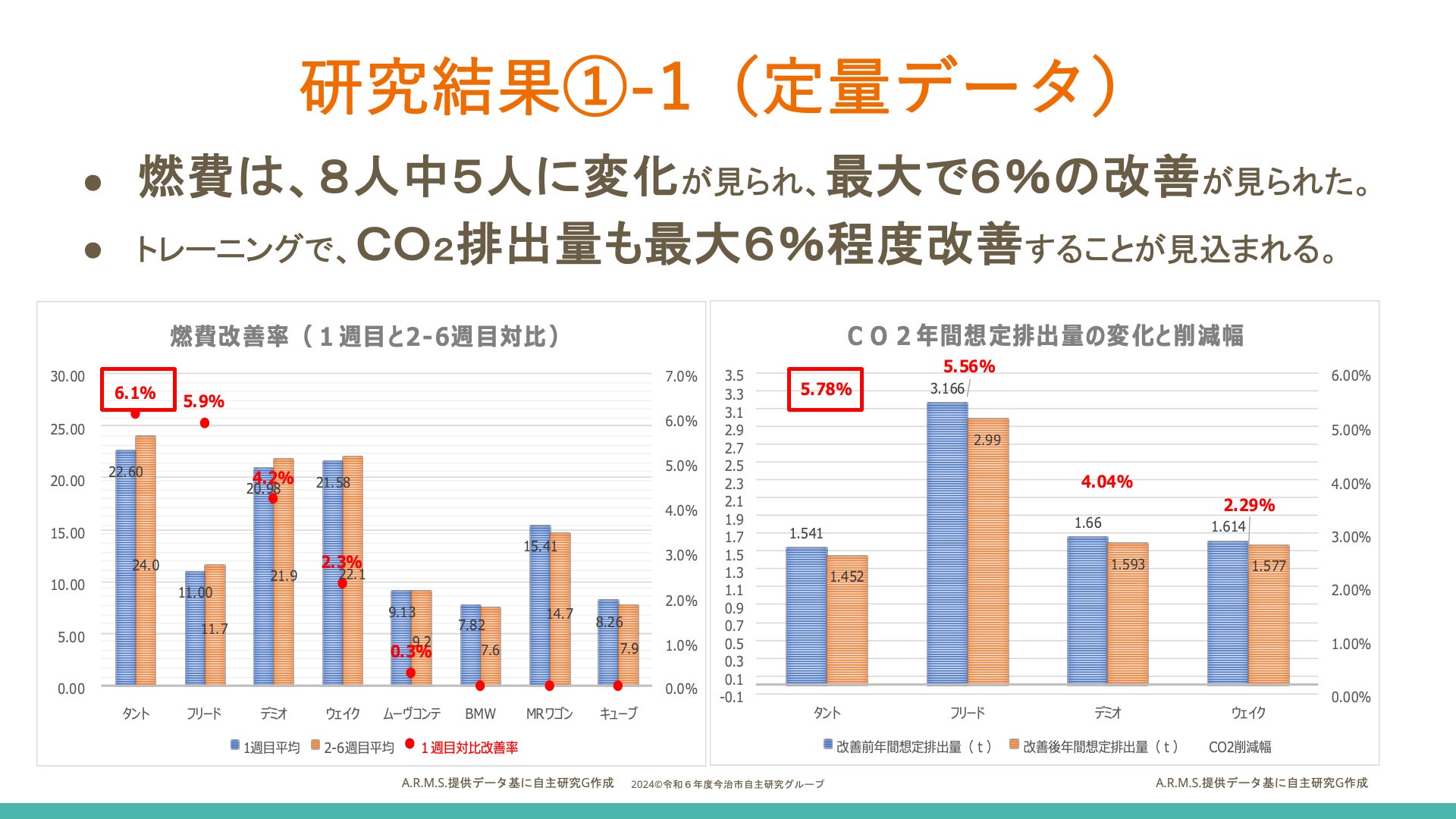 ゼロカーボンシティの実現に向けた実践の先駆けとして、アクセルトレーニングを最初に取り入れようと考えたのは、市職員の自主研究グループでした。2024年1月から3月にかけての実証実験には、職員有志8人が参加し、株式会社A.R.M.S.と東京海上日動火災保険株式会社の協力のもと行われました。その結果、8人中5人に燃料消費とCO2排出量ともに最大6%の削減効果が確認されると同時に、参加者全員の安全運転に対する意識が向上し、行動変容につながるという成果も得られました。