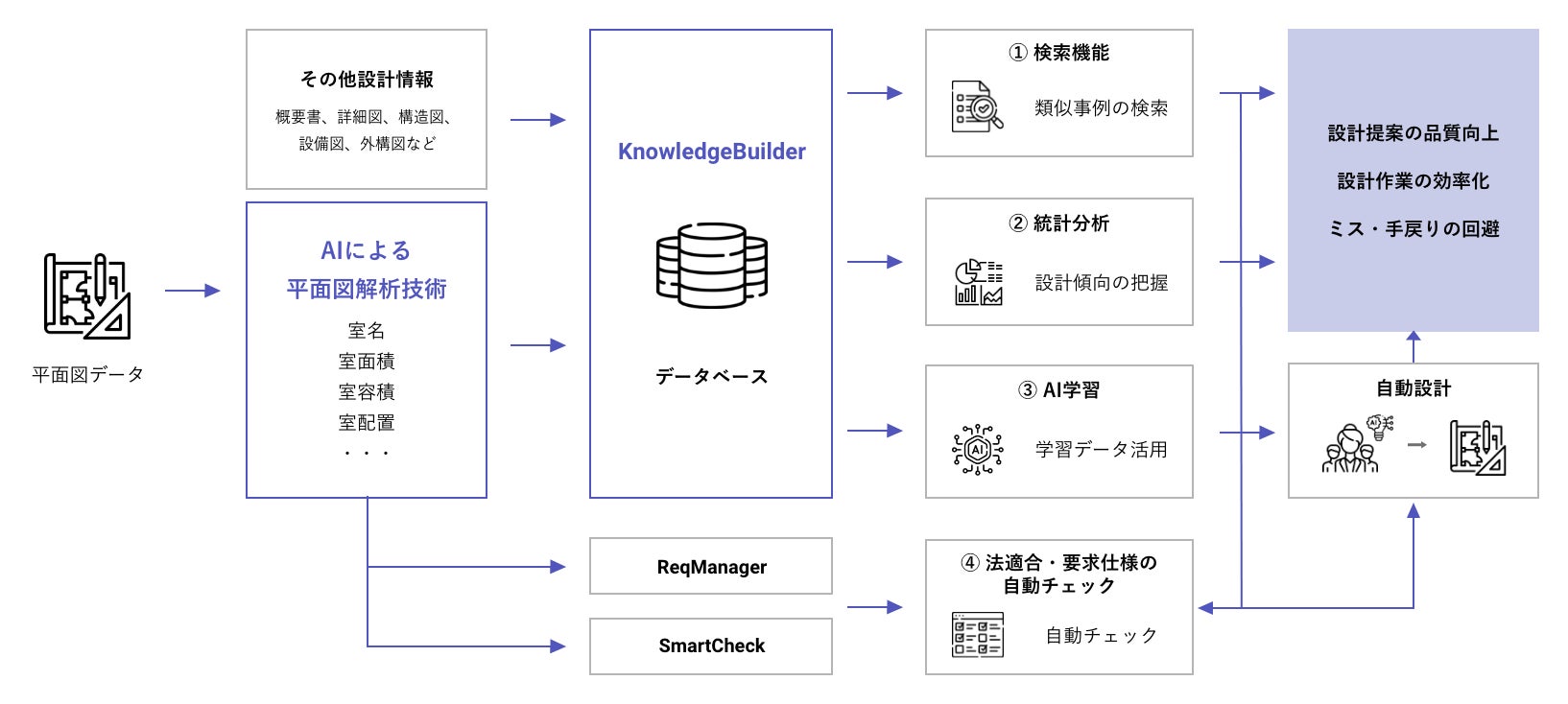 AIが解析・構造化したデータは「 KnowledgeBuilder 」に蓄積され、設計事例の検索や設計傾向の把握、AI による学習・自動設計に活用されます。さらには、ReqManager や SmartCheck では要件管理・基準チェックに利用でき、Tektome Platform 全体で高度な連携が可能になります。