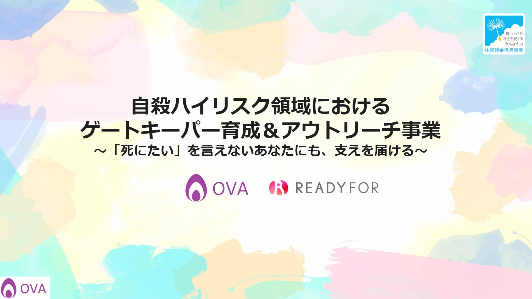 なお、本事業は休眠預金活用事業の運営ノウハウを持つREADYFOR株式会社とコンソーシアムを形成し、運営・伴走体制を構築します*)。OVAは自殺相談の研修やデジタルアウトリーチに関する実行支援、READYFORは過去の休眠預金活用事業の経験を活かした事業運営のほか、実行団体に対する基盤強化の伴走・評価設計などを実施する予定です。