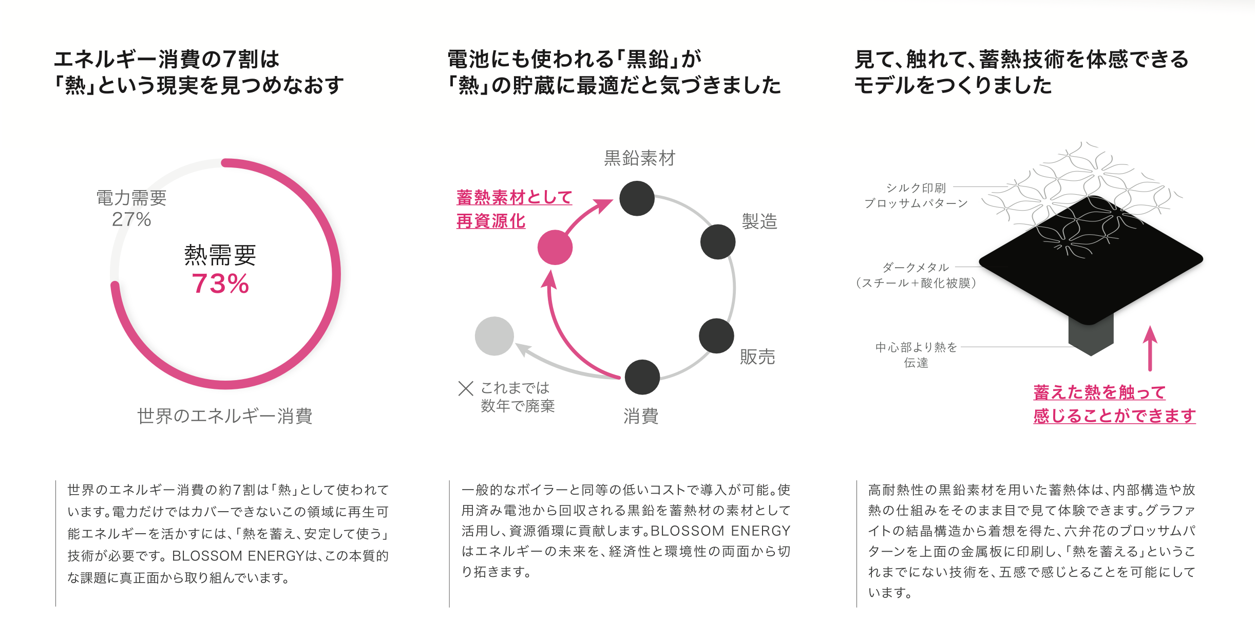 事業内容 :世界のエネルギー消費の約80%が依然として化石燃料に依存しています。製造業のGDP比率が高い日本では、特に熱エネルギーの脱炭素化が重要です。Blossom Energyは、熱の脱炭素化をテーマに、蓄熱電池をはじめとする次世代エネルギー技術の研究開発・製造・販売に取り組んでいます。