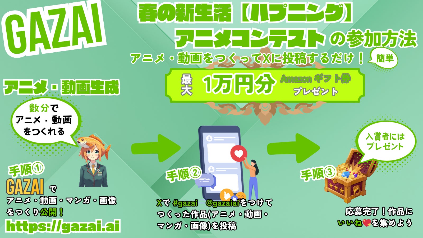 株式会社GAZAI(本社:東京都渋谷区、代表取締役:一岡亮大、以下「当社」)は、生成AIプラットフォーム「GAZAI」(https://gazai.ai/)にて、4/8(火)11:00から4/21(月)23:59迄、アニメ・動画・漫画・画像を生成できるAI機能を活用して春の新生活【ハプニング】アニメコンテストを実施致します。