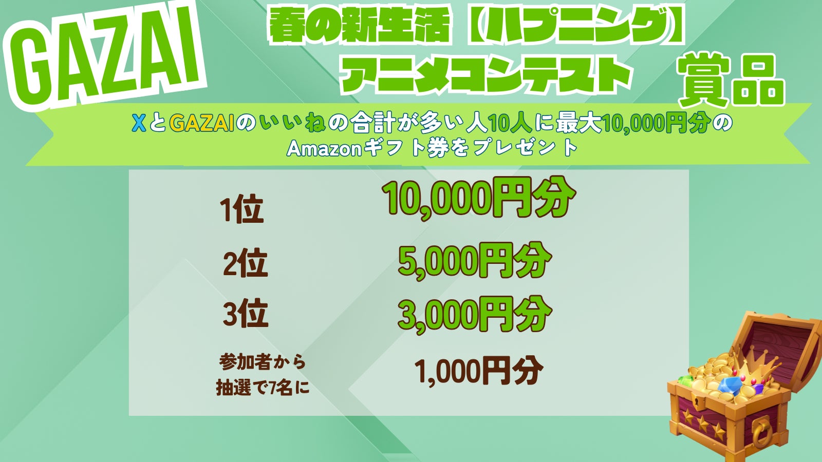 X(旧称:Twitter)の「いいね」数 と GAZAI内の「いいね」数の合算で順位をつけ、多い人が優勝となります。更に投稿した人の中から抽選で7名様に1,000円分のAmazonギフト券をプレゼント致します。