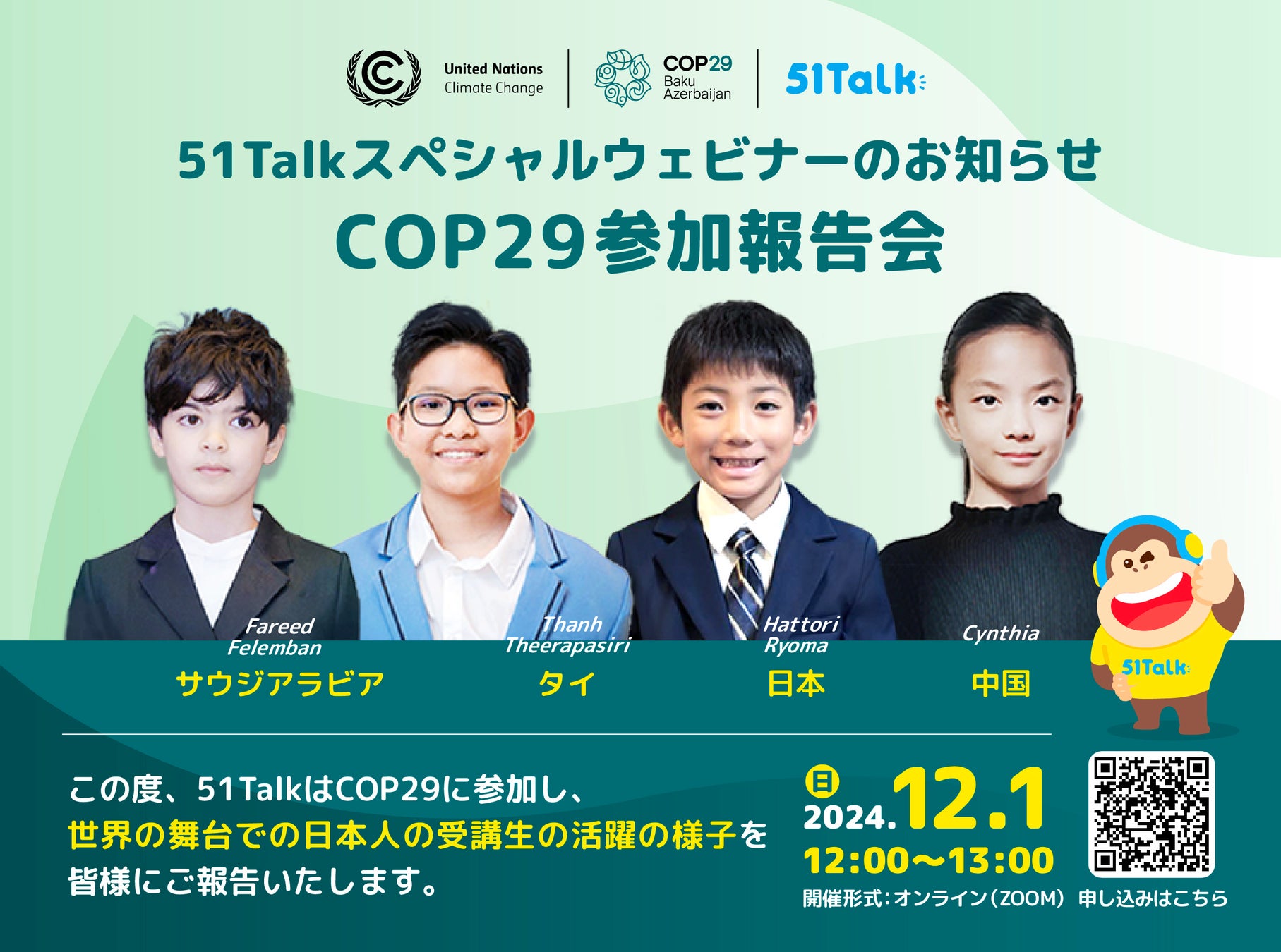 世界最大級のオンライン英語学習プラットフォームを提供する51トーク・オンライン・エデュケーション・グループ(本社:シンガポール、代表:Jiajia Huang)の日本法人である株式会社51Talk Japan(本社:東京都港区、代表:服部慶)では、当社サービスの受講生である小学1年生の服部龍馬さん(6歳)が、2024年11月11日からアゼルバイジャンの首都バクーで開催される気候変動枠組条約締約国会議(COP)※1 の「子どもと若者」をテーマとする部会(Youth in action, speak the future of the world)において、スピーチする予定です。その時間が日本時間11月20日(水)19時(現地時間 同日14時)に決定されました。また、スピーチの様子は、当社YouTube公式ページで配信されます。(COP29 Azerbaijanページでの配信も予定)