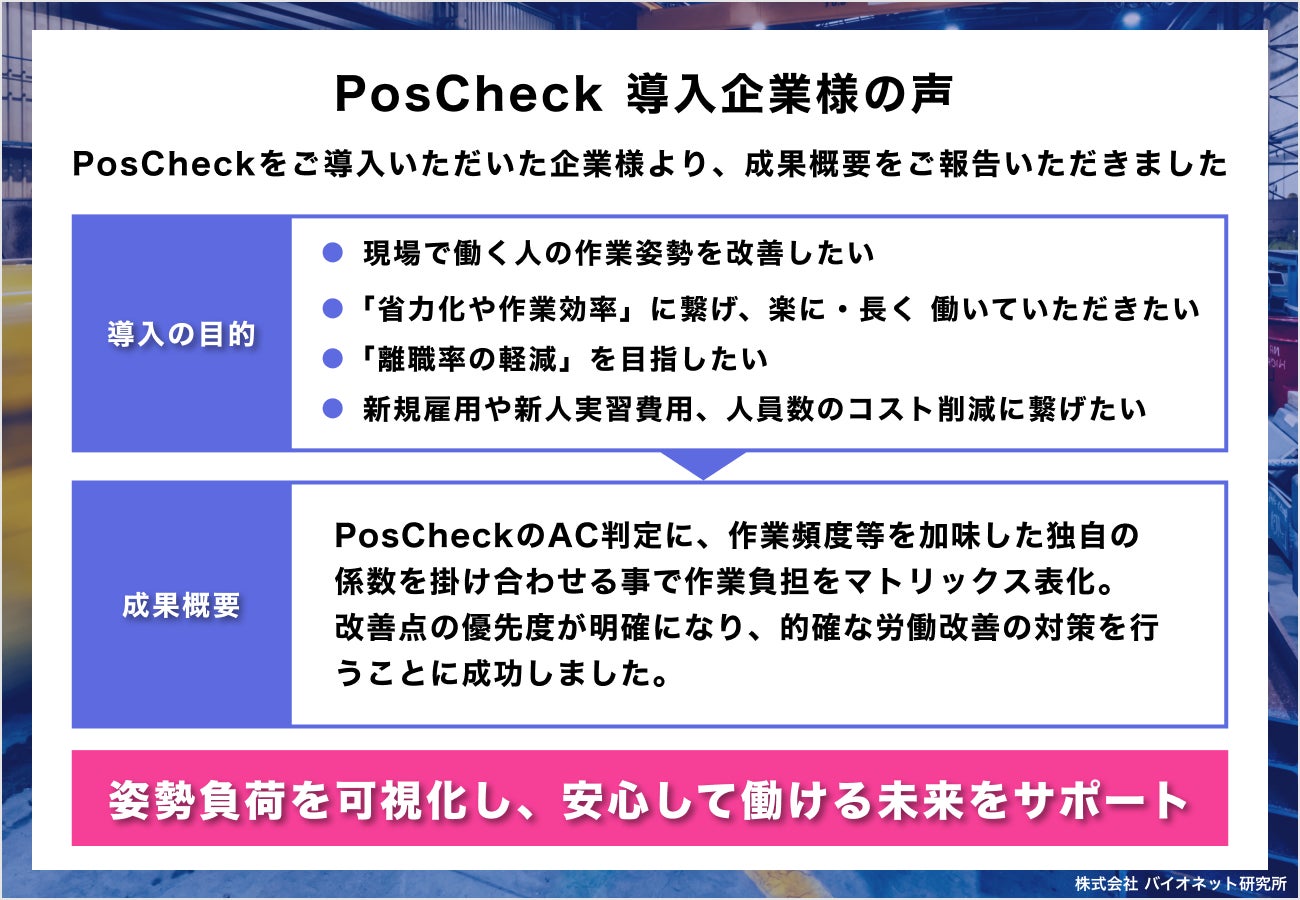 《生産現場での腰痛予防に》作業負荷自動計測システムPosCheck-101をご導入いただいたビューテック株式会社様より、成果概要をご報告いただきました。