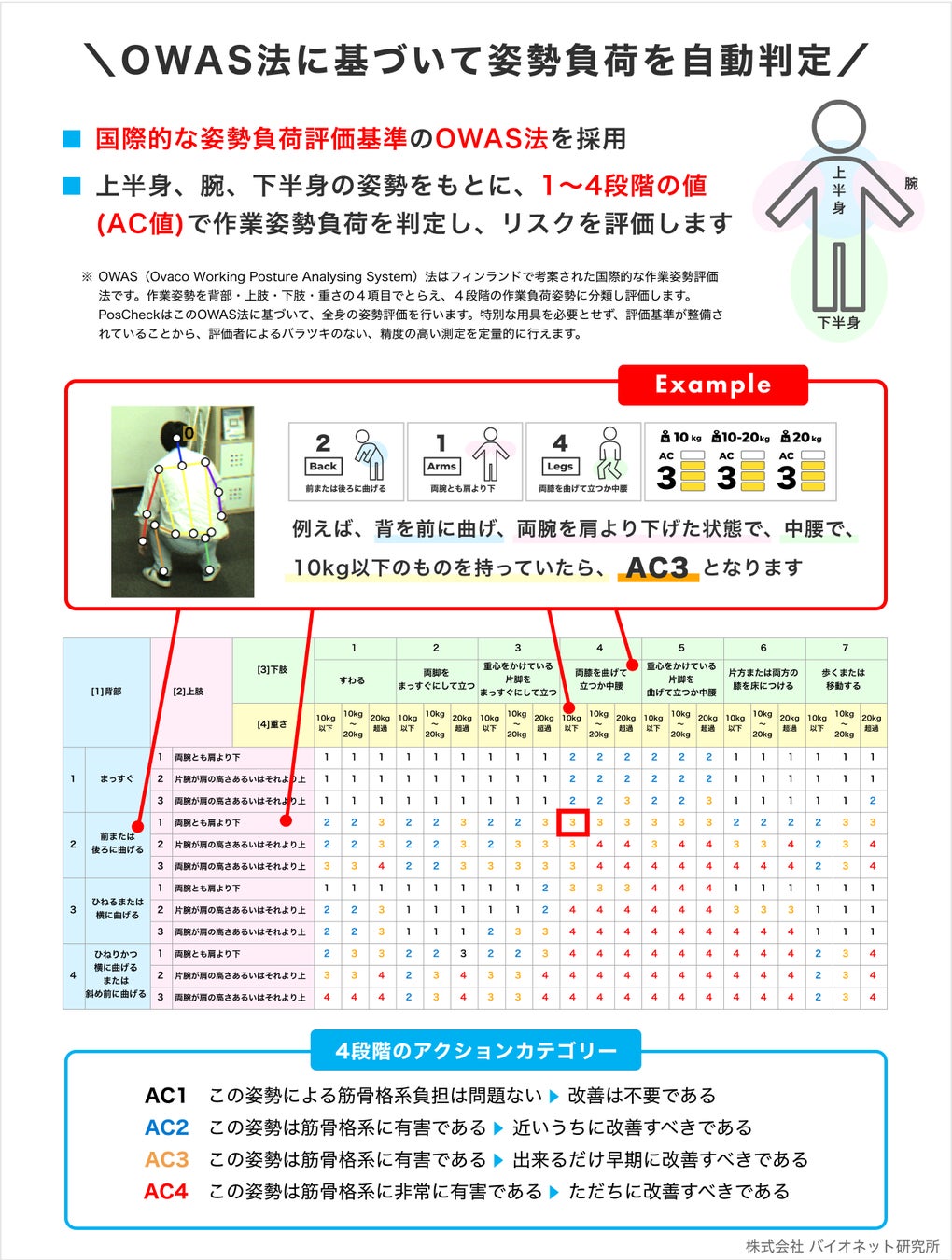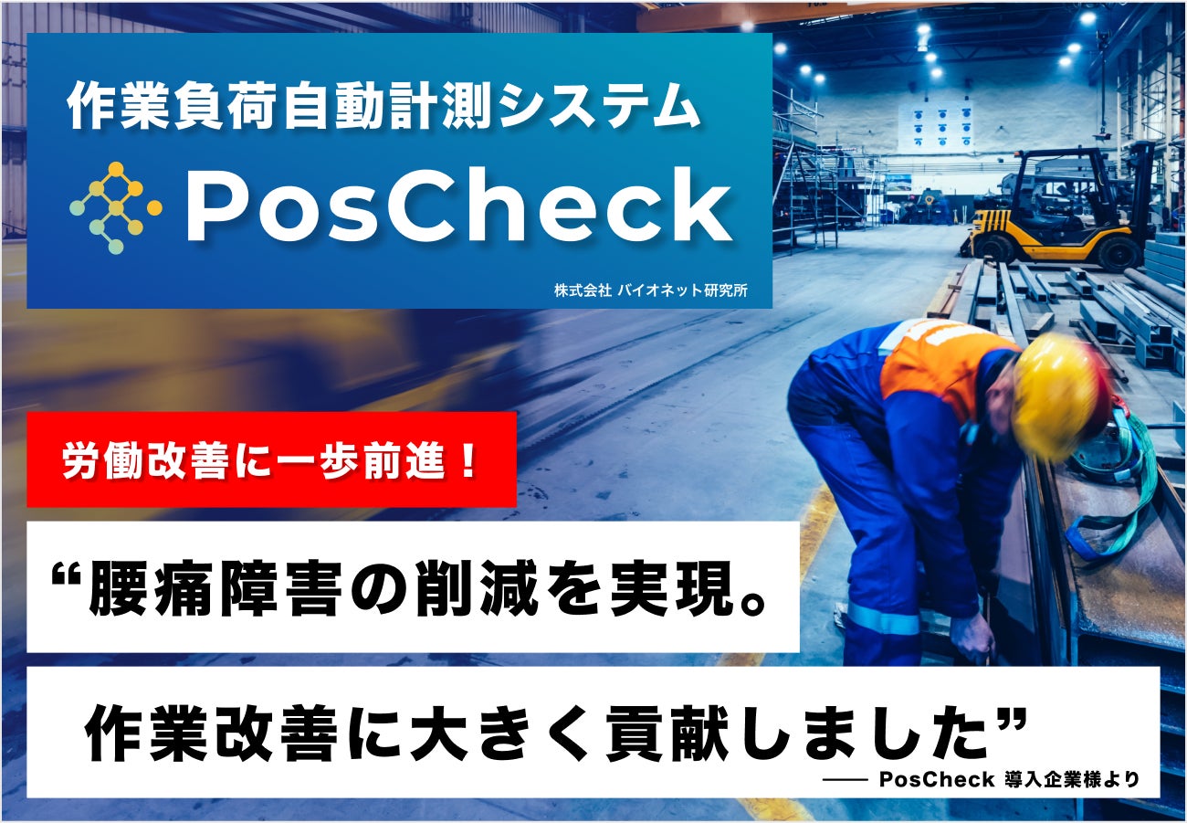 株式会社バイオネット研究所(所在地:東京都立川市 代表取締役:新川隆朗)では工場作業者の腰痛原因となる作業姿勢を自動計測する 『作業負荷自動計測システムPosCheck-101(以後PosCheck)』をご導入いただいたビューテック株式会社様(所在地:愛知県豊田市)よりPosCheck活用の成果報告を頂きましたので発表させていただきます。
