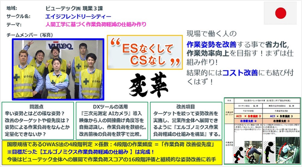 大手ガラスメーカー様の製造請負事業をされているビューテック知多事業所様は2024年1月にPosCheckを導入され、国際的な作業負荷評価基準のOWAS法の自動計測機能を活用し短期間に様々な工程の作業負荷を計測調査され、作業改善に大きな成果を上げられました。その成果を国内82拠点が競う社内 安全衛生大会2024において発表され、最優秀賞を獲得されました。また、客先主催の2024国内改善大会でも特別賞を受賞されました。