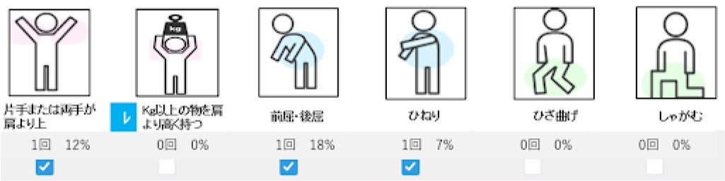 PosCheck-102はPosCheck-101のOWAS法の負荷評価に加え、繰り返し頻度と累積時間を数値化するソフトウェア『3D-ERGO』を追加しております。負荷姿勢の繰り返し回数と累積時間をリアルタイムで計測・評価 し、OWAS法の負荷の高い5種類の姿勢(腕上げ、前後屈、上体ひねり、ひざ曲げ、しゃがむ)と荷重の有る持ち上げの負荷を判定します。