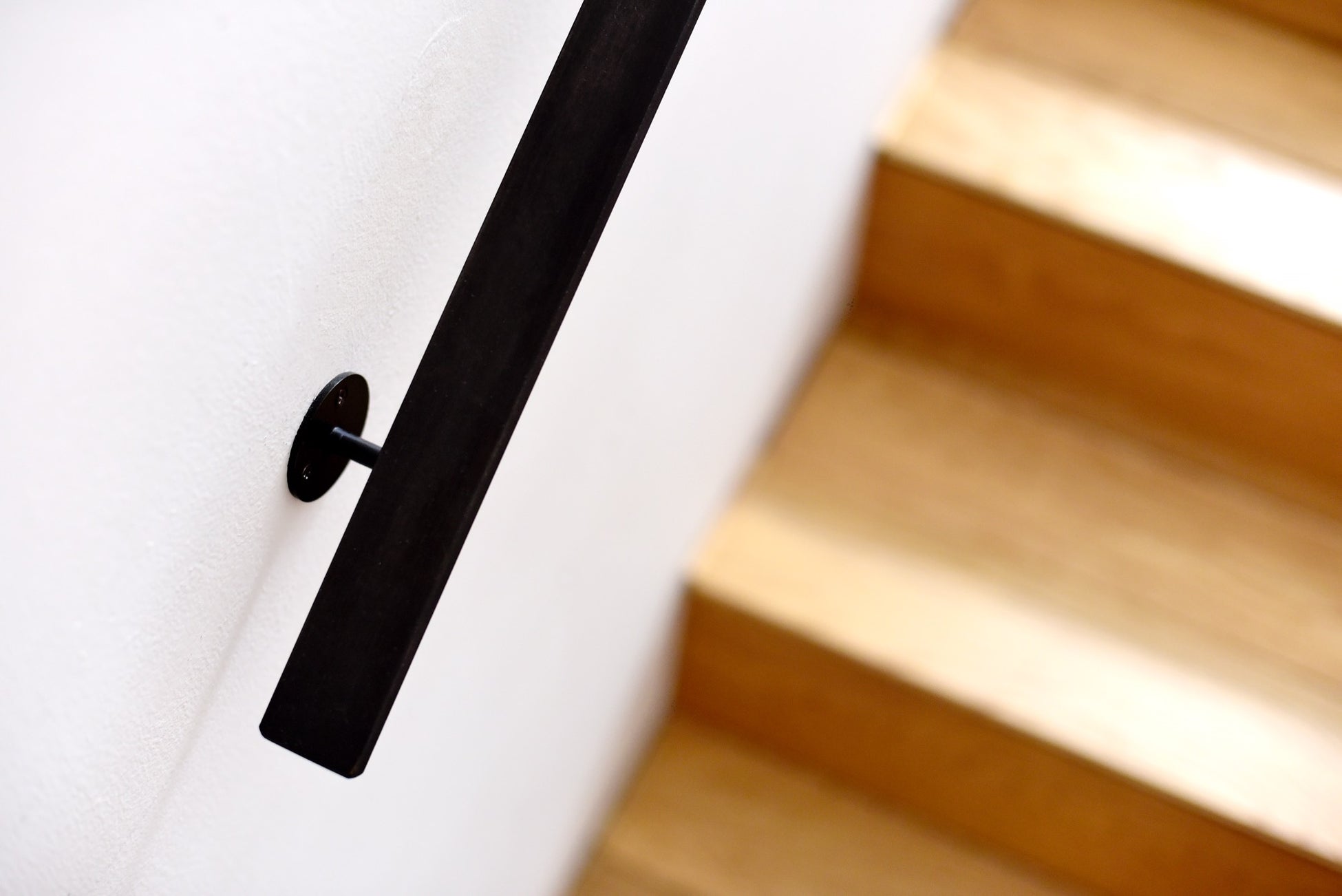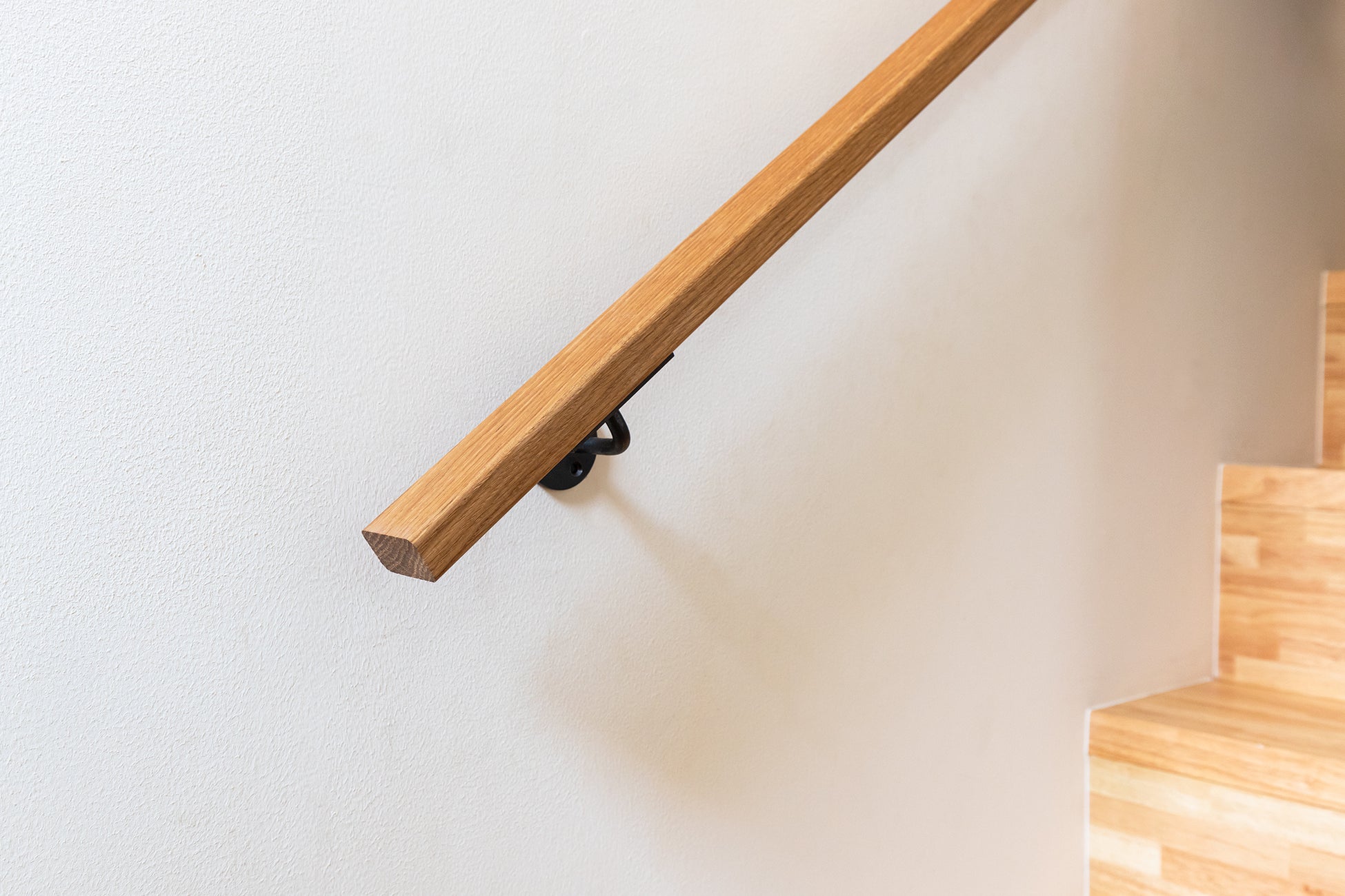 無垢の手摺棒と、黒皮鉄のブラケットの手摺です。手に自然と収まる輪郭と、すっきりとした見た目で、長く暮らしに寄り添ってくれます。