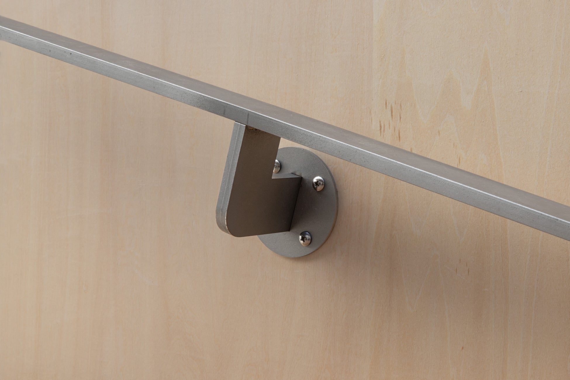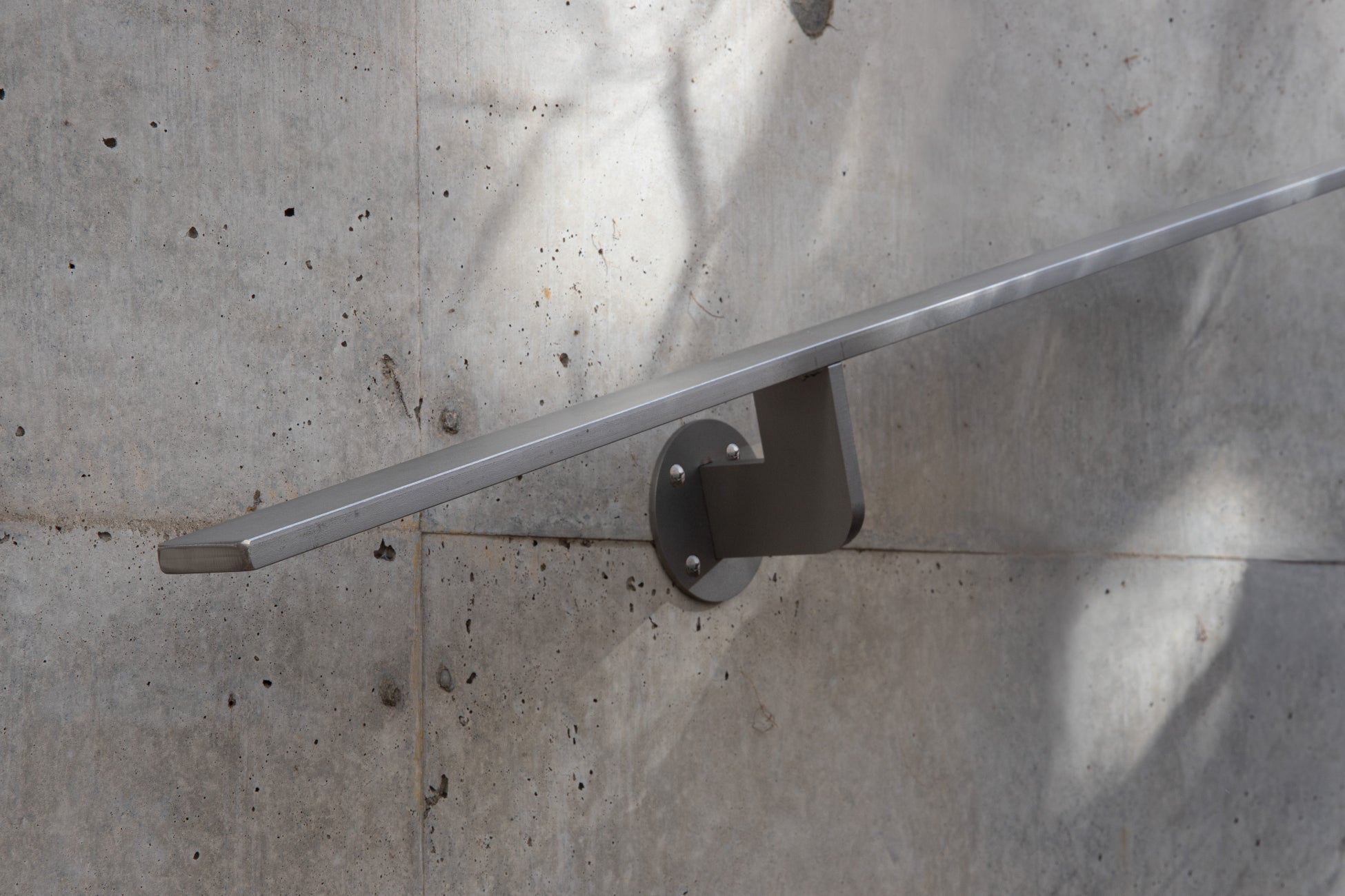 フラットバーとブラケットは共にホット材の板材を切り出して加工。ホット材のずっしりとした量感を感じられる仕上がりです。素材が持つソリッドな印象を感じられるよう、フラットバーはほぼピン角に。水に強く錆びにくいステンレスであるため、屋外でも使用いただけます。