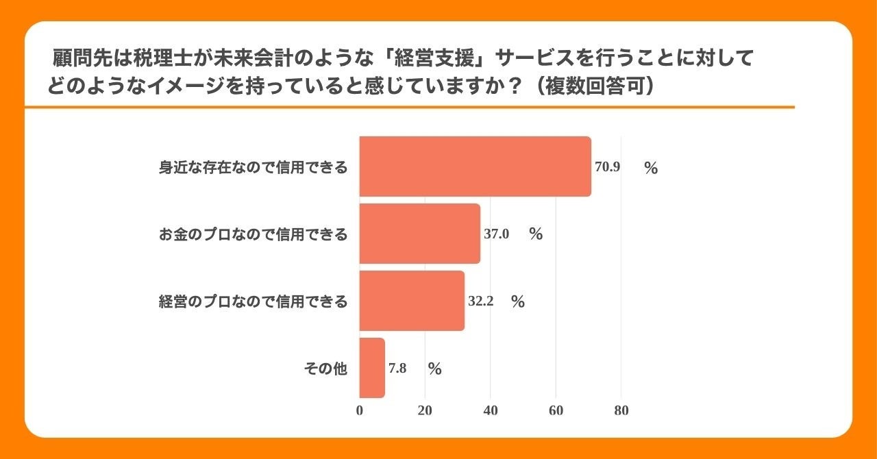 顧問先の経営者は会計事務所が未来会計のような経営支援サービスを行うことに対してどのようなイメージを持っていると思うか聞いたところ、「身近な存在なので信用できる」と回答した人が70.9%、「お金のプロなので信用できる」と回答した人が37%、「経営のプロなので信用できる」と回答した人が32.2%という結果になりました。