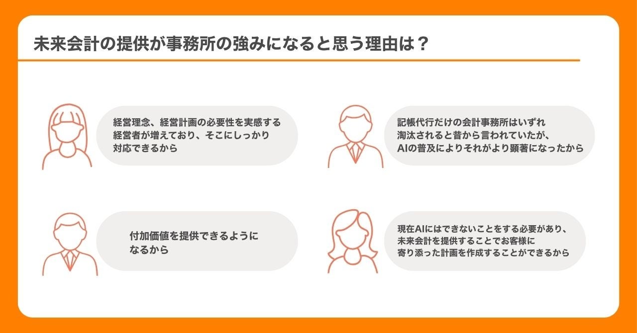 「現在AIにはできないことをする必要があり、未来会計を提供することでお客様に寄り添った計画を作成することができるから。」
