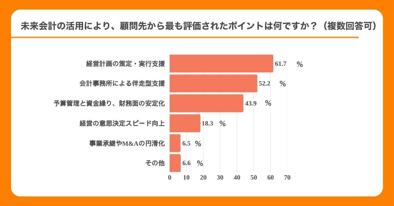 未来会計の導入により顧問先から評価されたポイントは、「経営計画の策定・実行支援」が61.7%、ついで「会計事務所による伴走型支援」が52.2%となった。